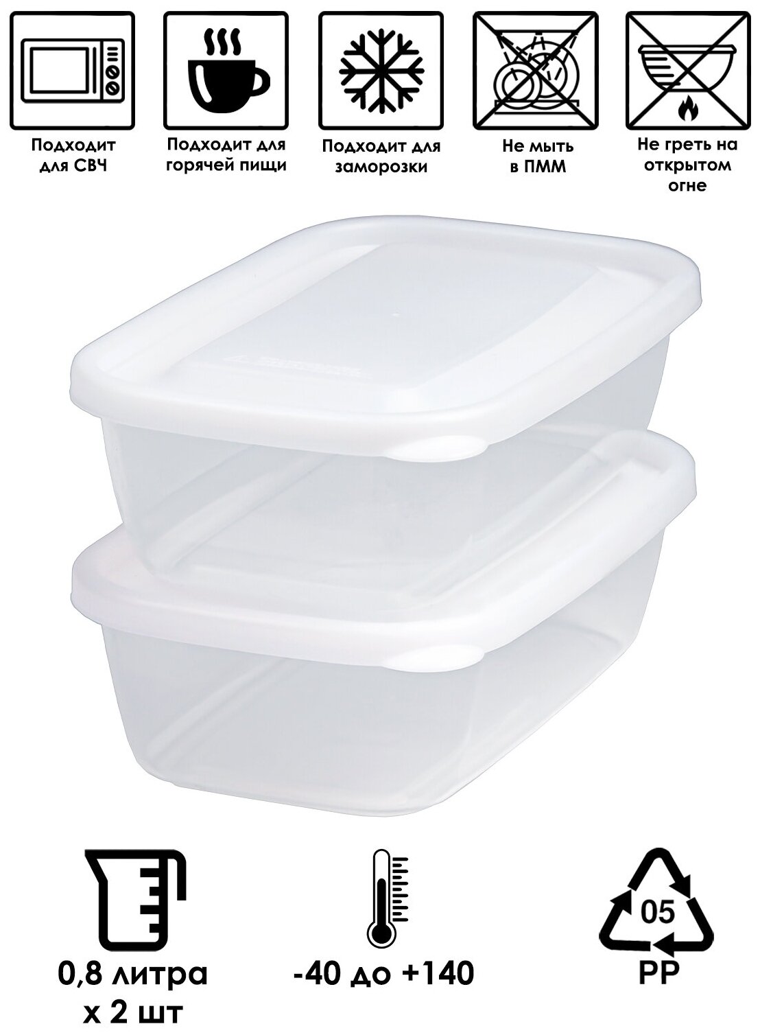 Контейнер для еды пластиковый с крышкой набор 2 шт, 750 мл (Е), 14,4*14,4*6,5 см