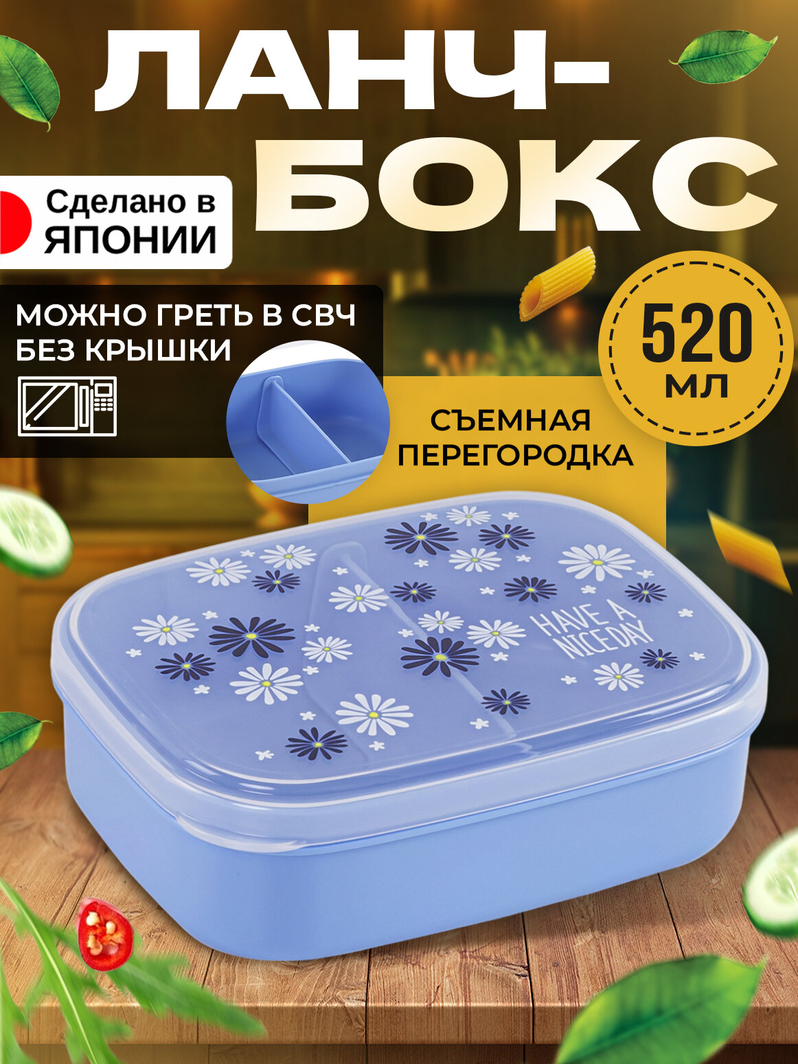 Контейнер для еды пластиковый с крышкой ланч-бокс размер S 510 мл, 18,2х8х5 см голубой с цветами
