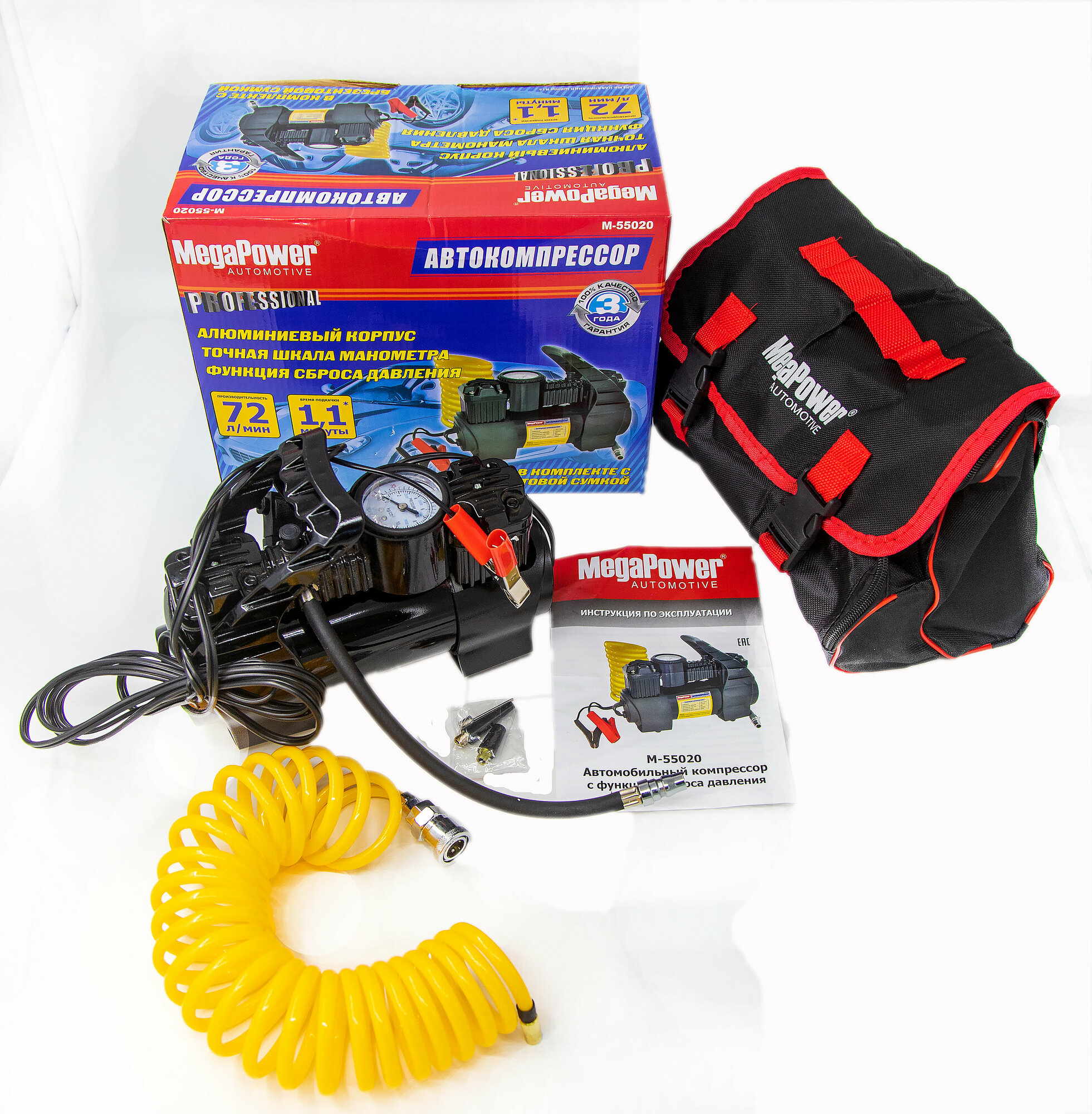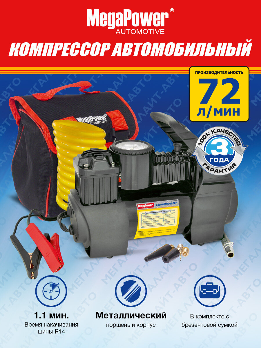 MEGAPOWER-AUTOMOTIVE M-55020 Компрессор автомобильный 72л/мин. 10атм. 30А 12V на клеммы АКБ MEGAPOWER