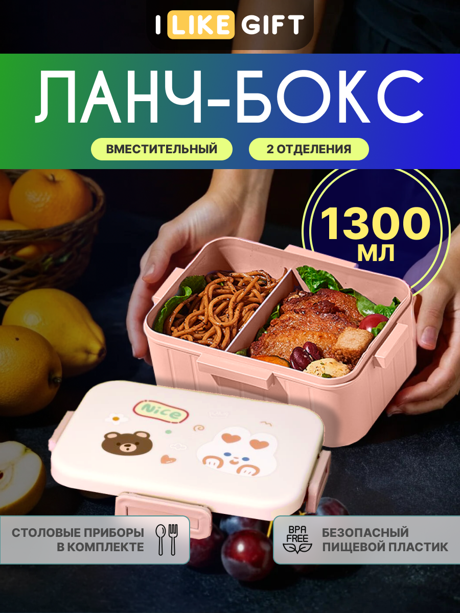 Ланч бокс для еды, контейнер секционный с приборами, пищевой пластик, 1000 мл
