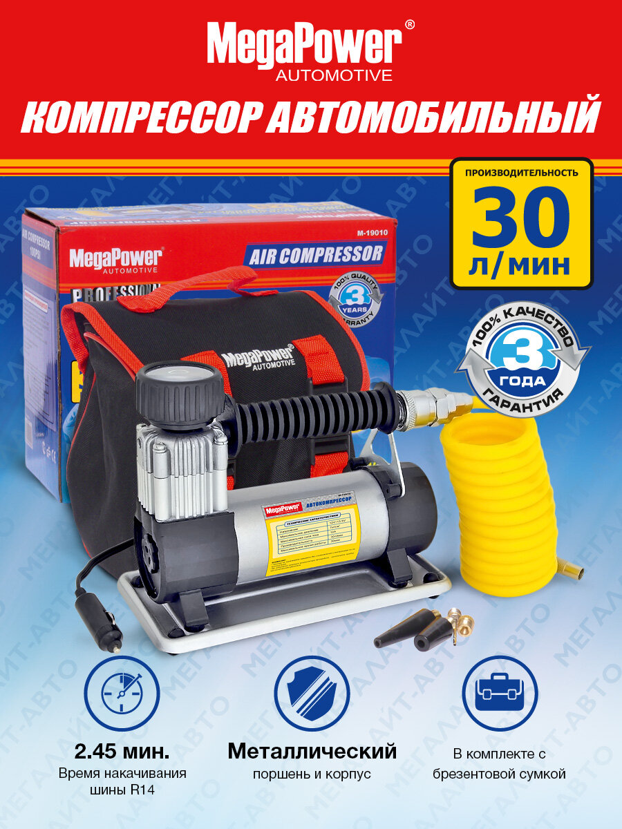 СохранитьКомпрессор M-19010 поршневой 100PSI (30л/мин, 12А) удлиненный шланг, в сумке 12V MEGAPOWER /1/12 HIT интересное: