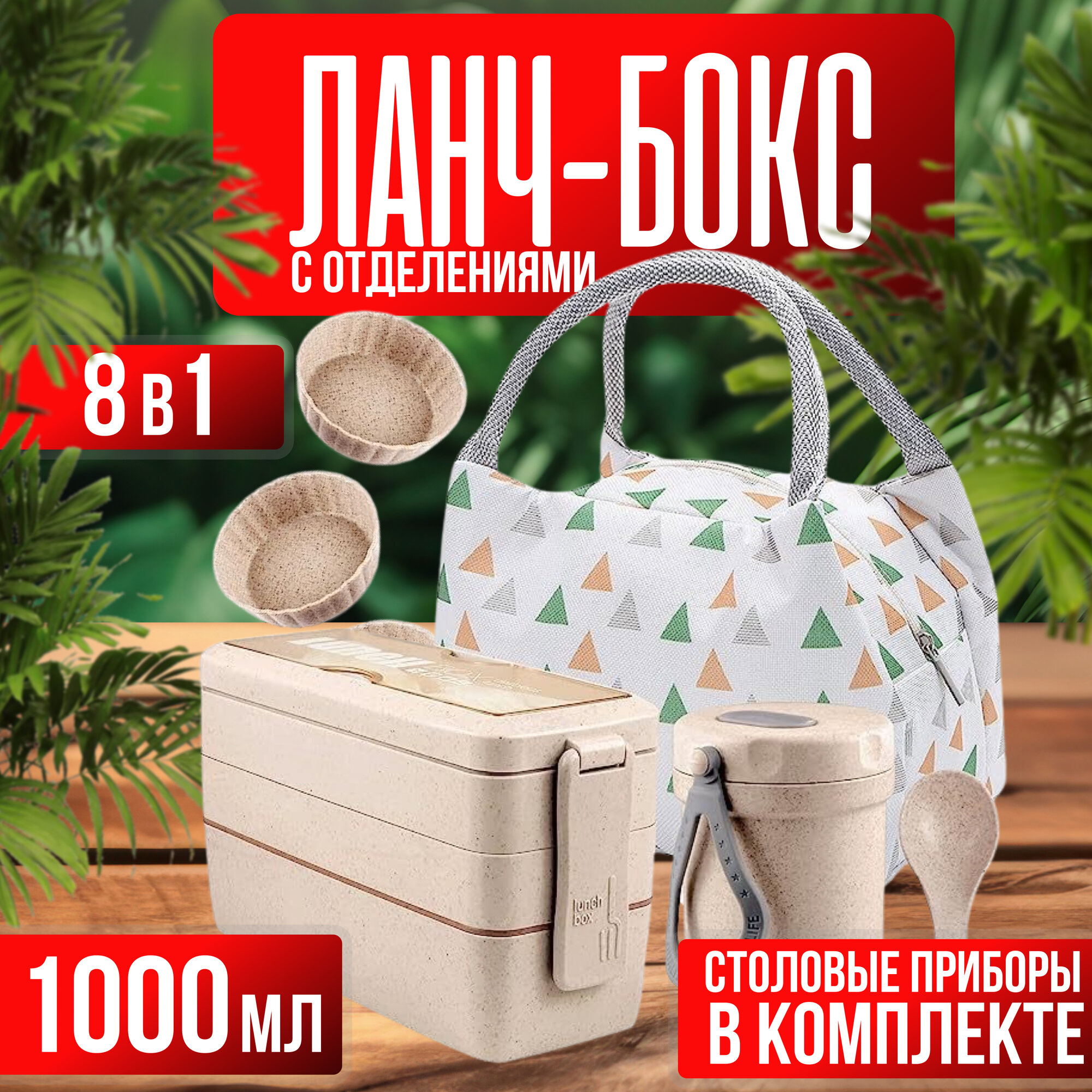 Ланч бокс с приборами герметичный с сумкой контейнер для еды, 8 предметов, бежевый интересное: