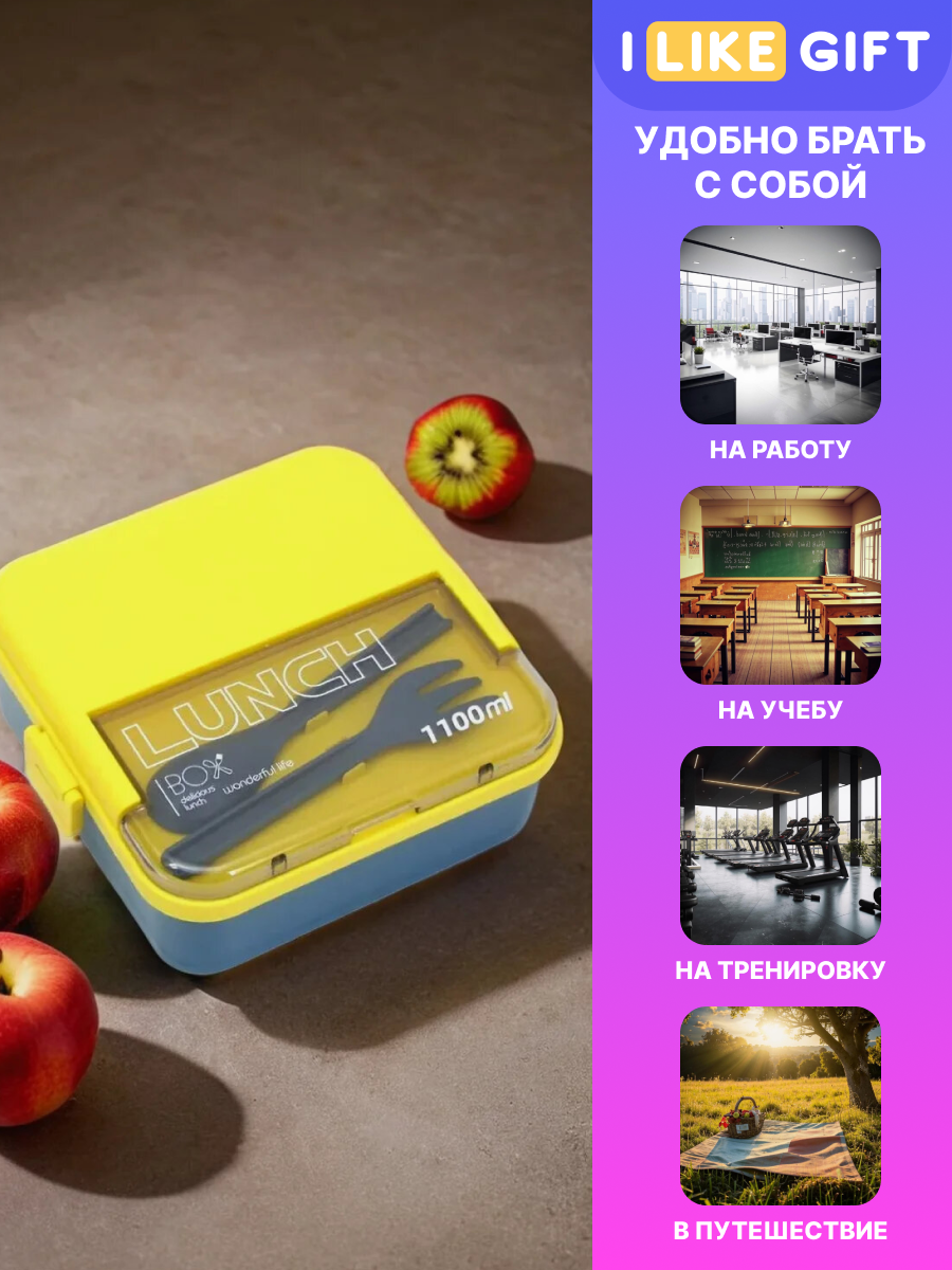 Ланч бокс "Square" для еды с приборами, пищевой пластик, 1100 мл