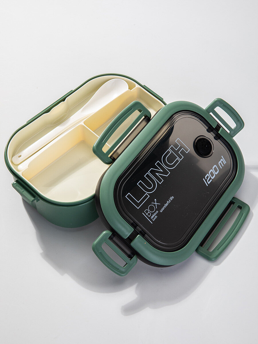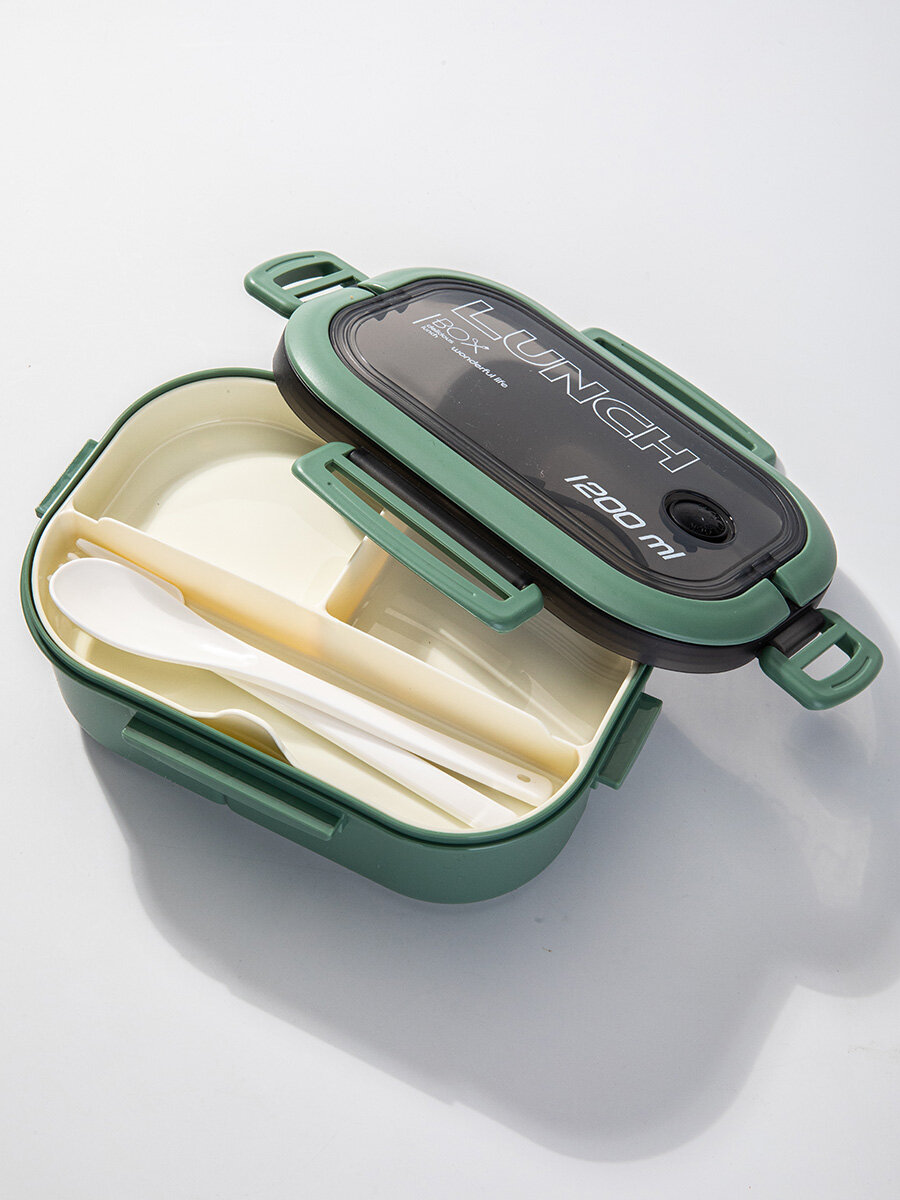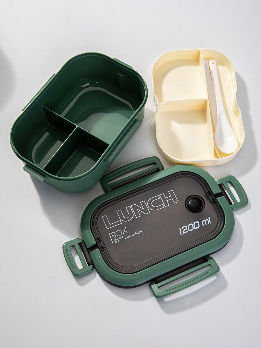 Купить Ланч-бокс для еды пластиковый двухуровневый со столовыми приборами зеленый