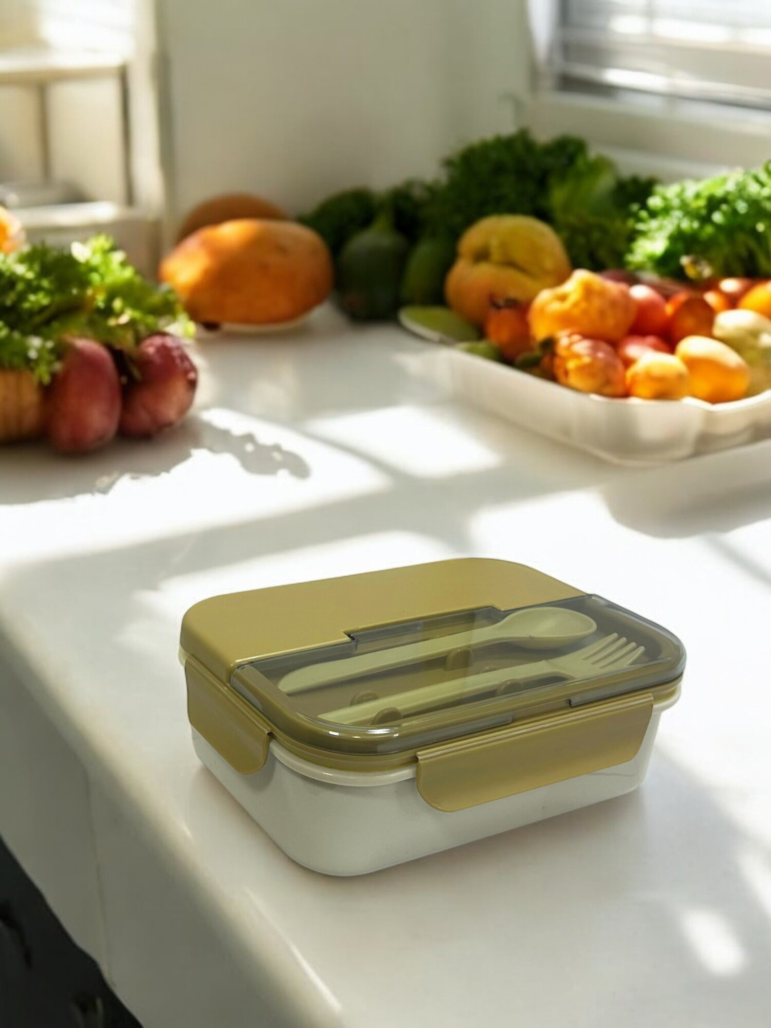 Ланч-бокс пластик, герметичный, с ложкой и вилкой на 3 отделения