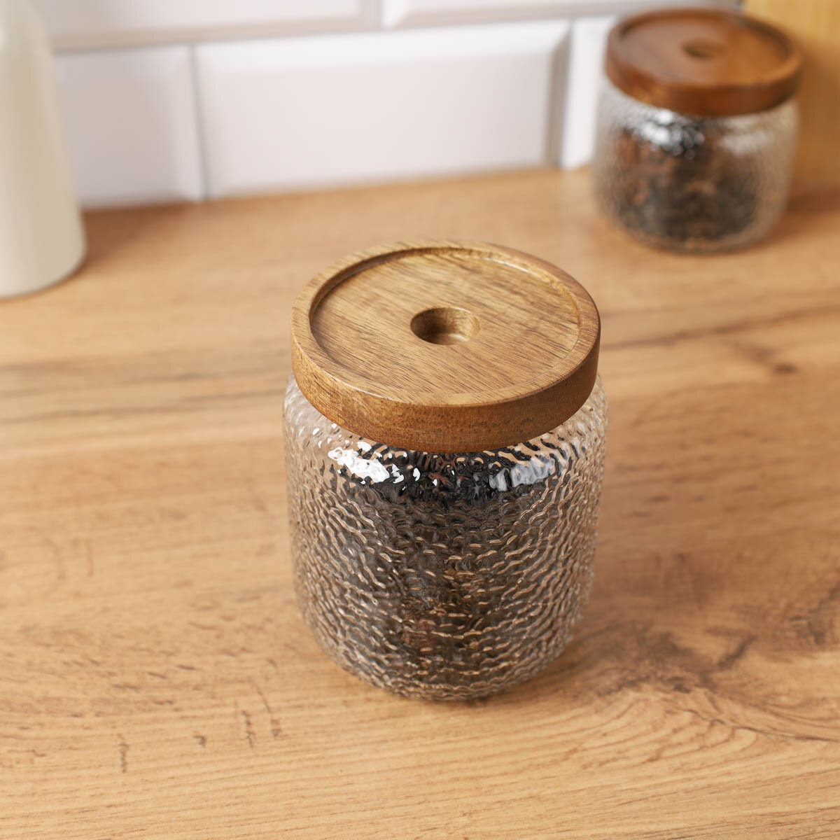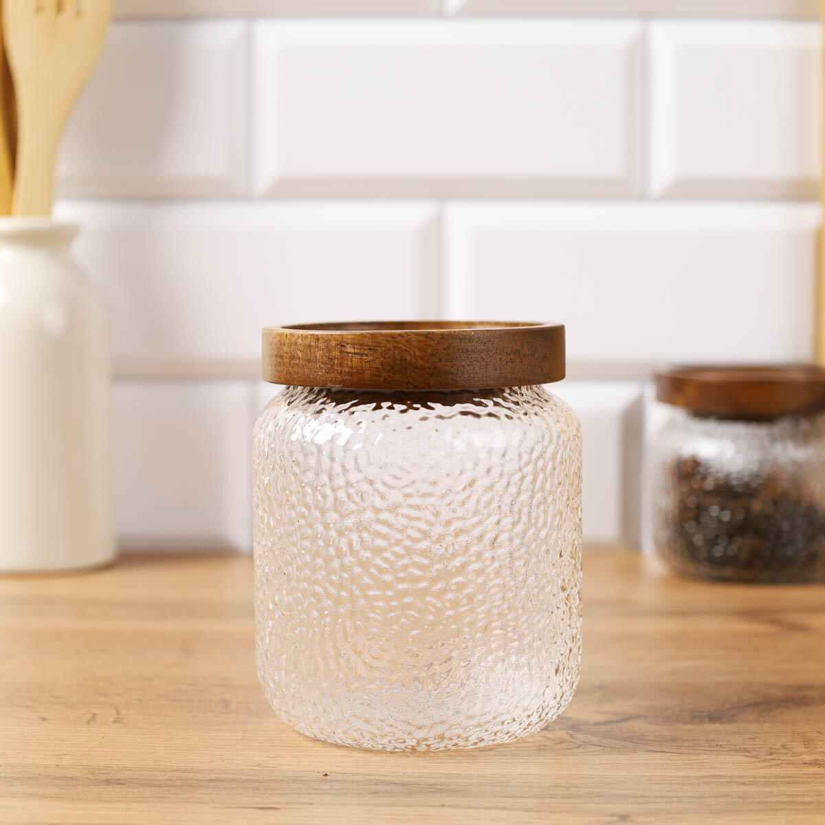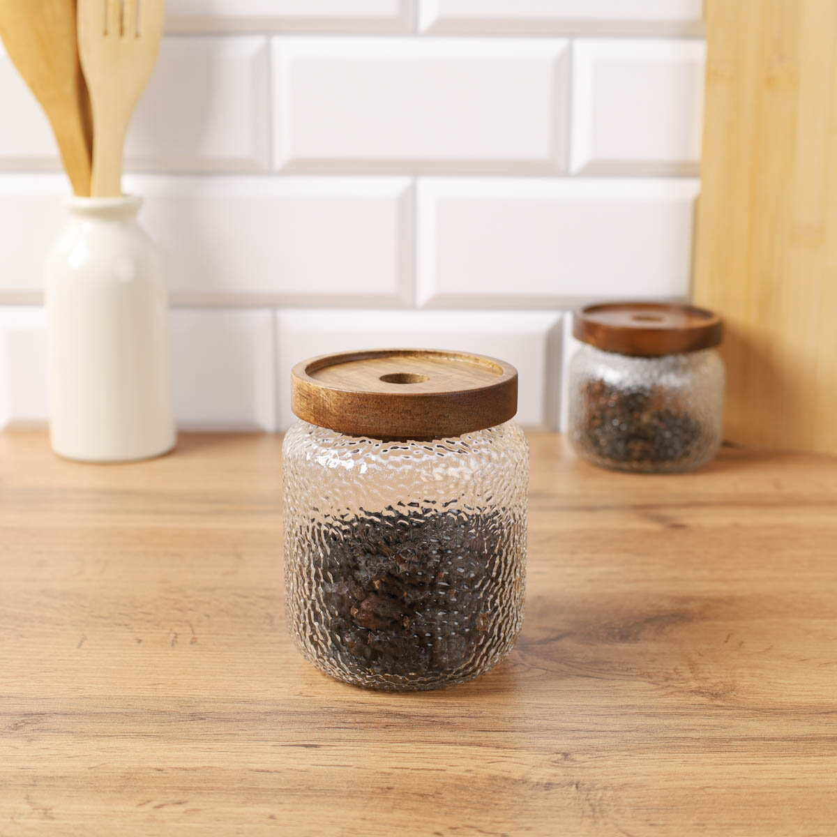 Купить Банка для хранения сыпучих 500 мл, 11.8х9.4 см, деревянная крышка, стекло