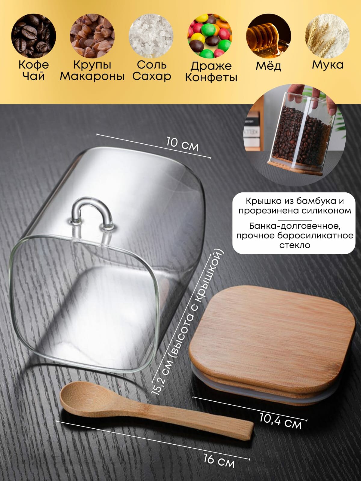 Банка для хранения продуктов, стеклянная, с крышкой, с ложкой, 1200 мл, набор из 4 штук