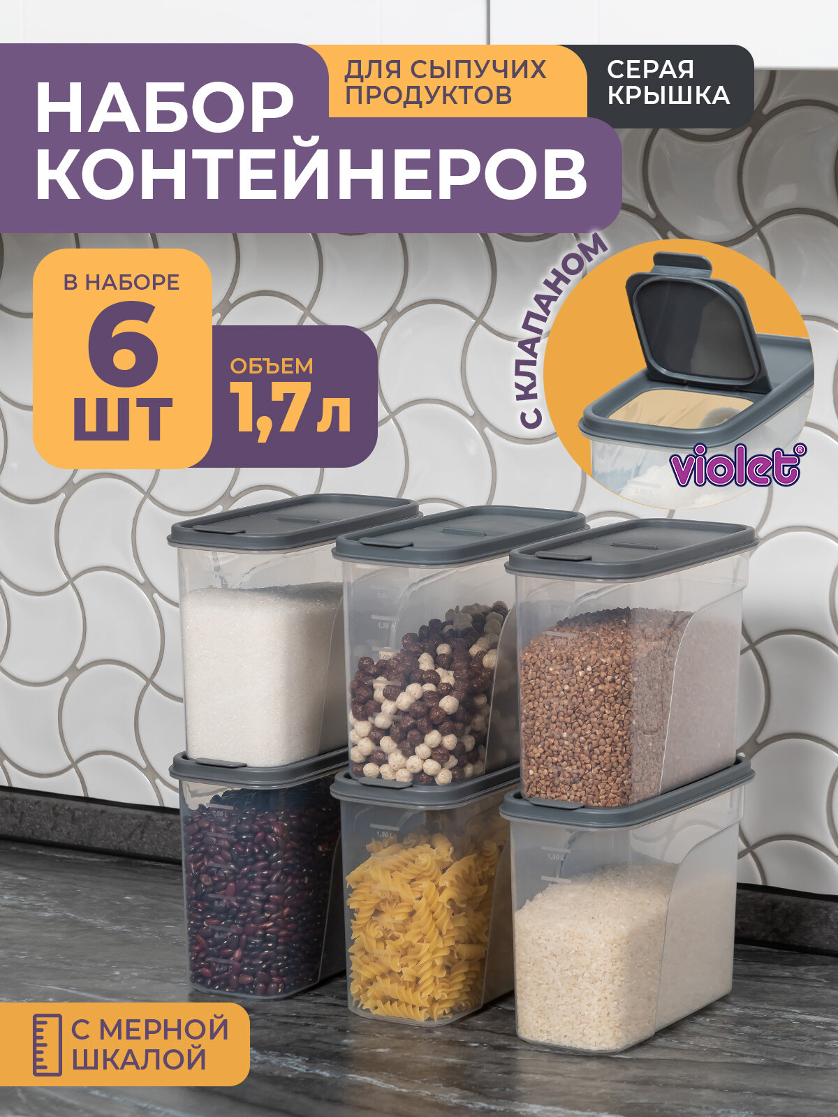 Купить Банки для сыпучих продуктов 1,7л -6 шт, цвет серый / набор контейнеров для хранения