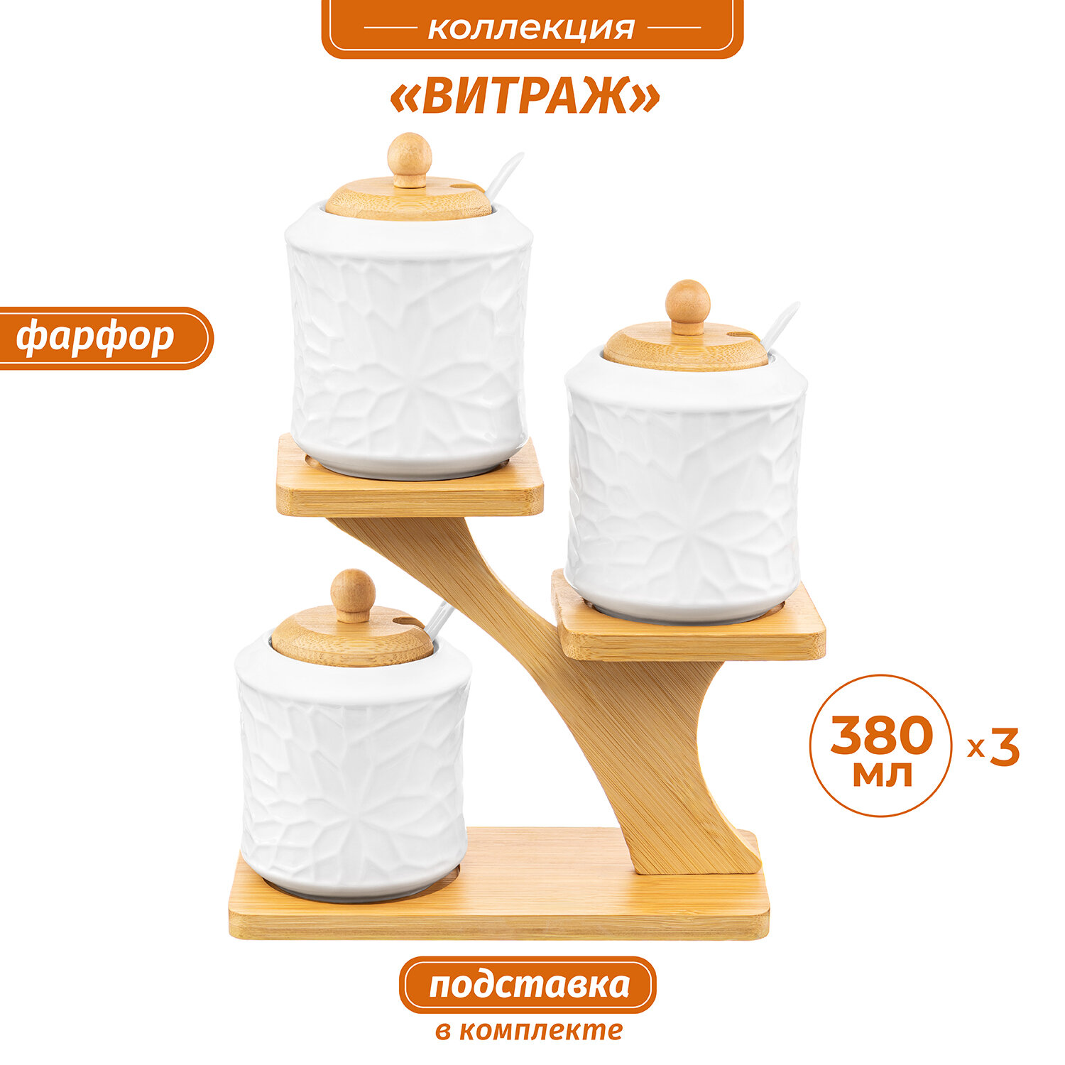 Банка для хранения сыпучих продуктов, соли, специй 3 шт по 380 мл Elan Gallery Витраж + крышки + ложки, на подст, набор интересное: