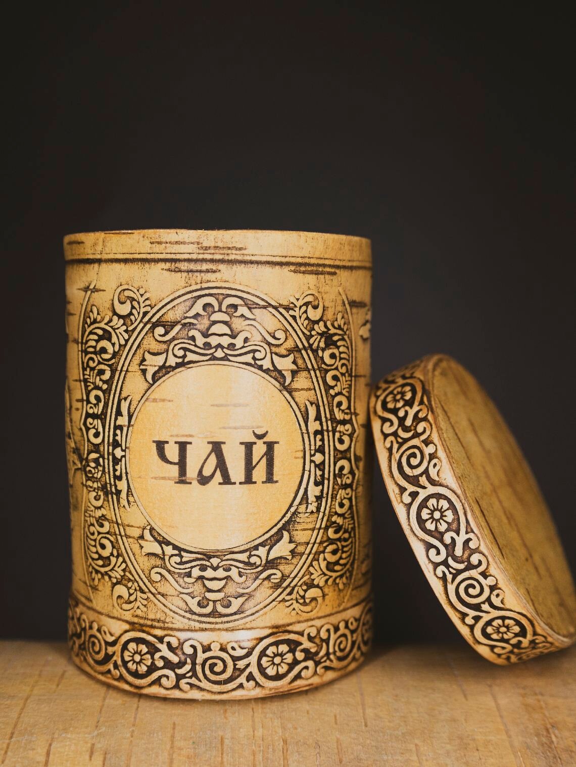 Банка для продуктов универсальная. Туес из бересты, тиснение "Чай", ручная работа. ТМ "русская береста" интересное: