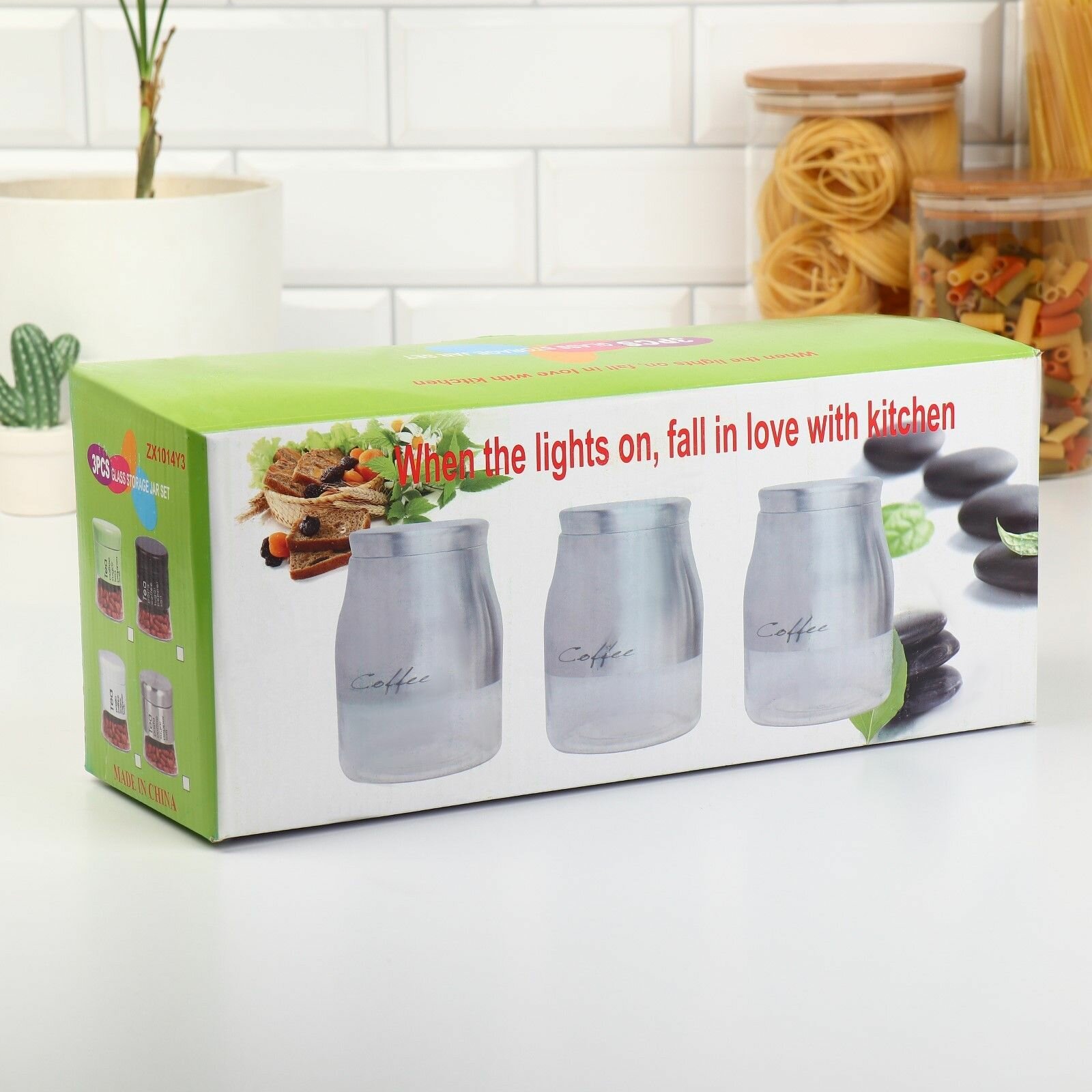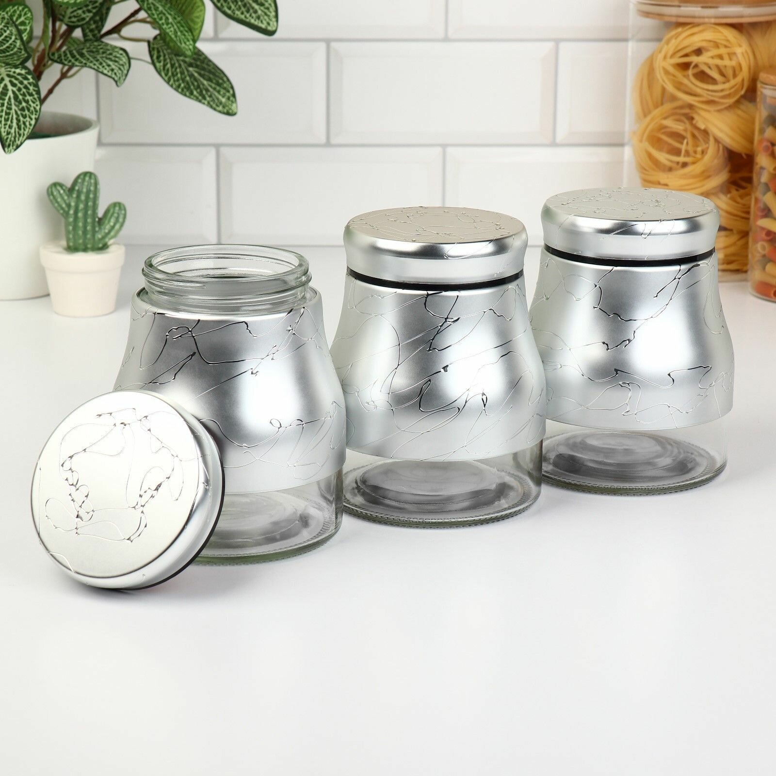 Купить Набор банок стеклянных для сыпучих продуктов "Мрамор", 850 мл, 11,5х14,5 см, 3 шт, цвет серебряный