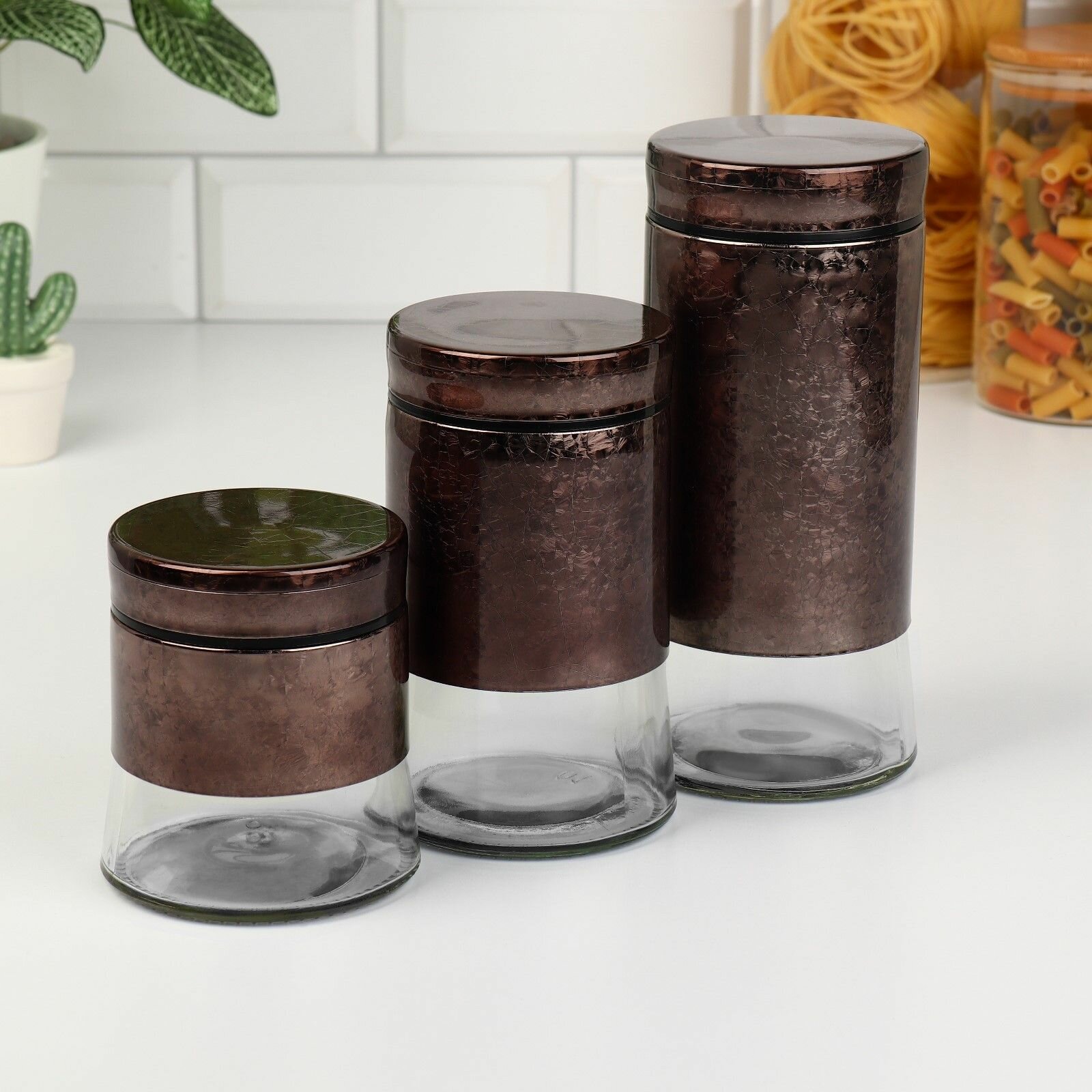 Купить Набор банок стеклянных для сыпучих продуктов "Богема", 3 предмета: 350/550/800 мл, цвет коричневый