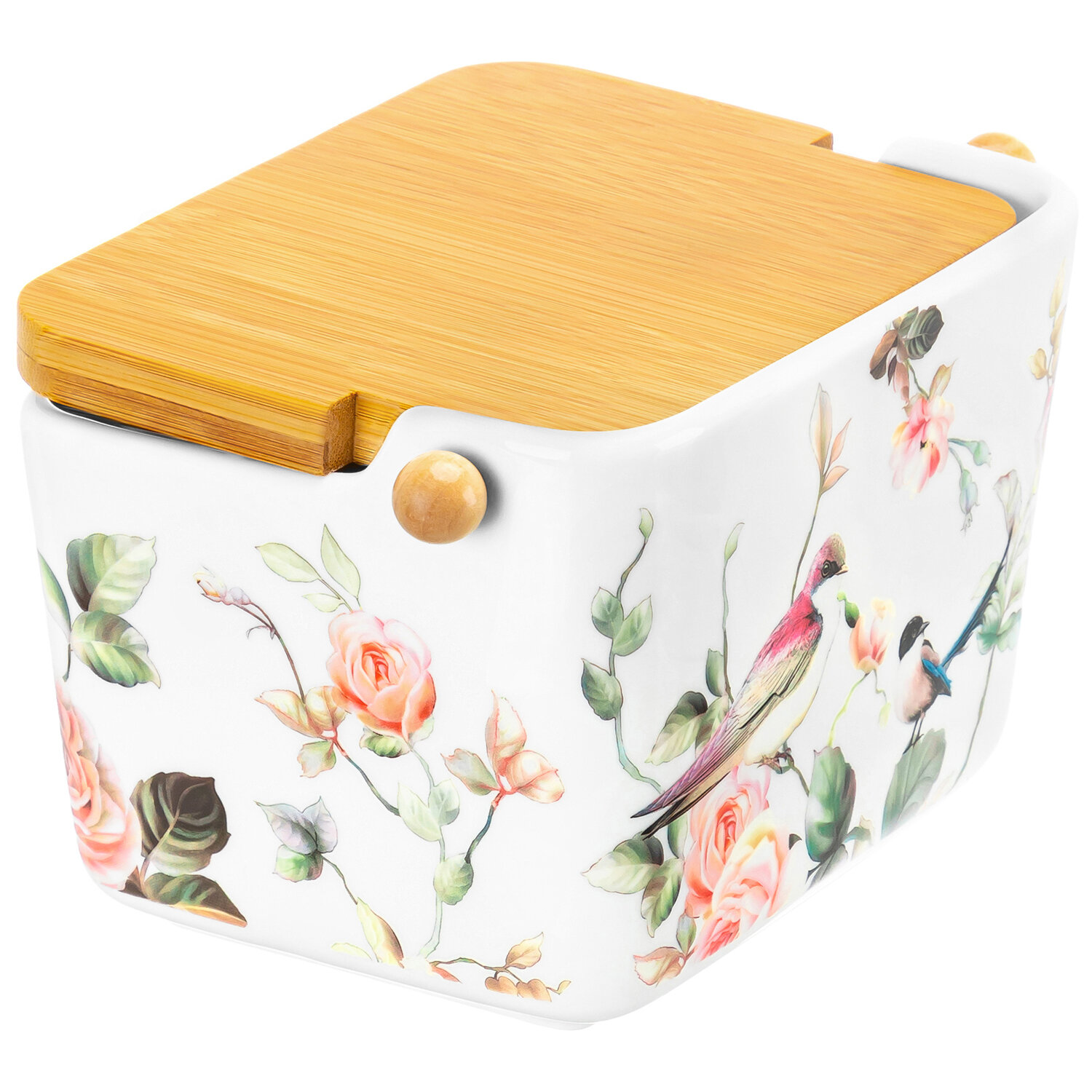 Купить Банка для хранения сыпучих продуктов 950 мл Elan Gallery "Певчие птички" +ложка+откидная бамбуковая крышка