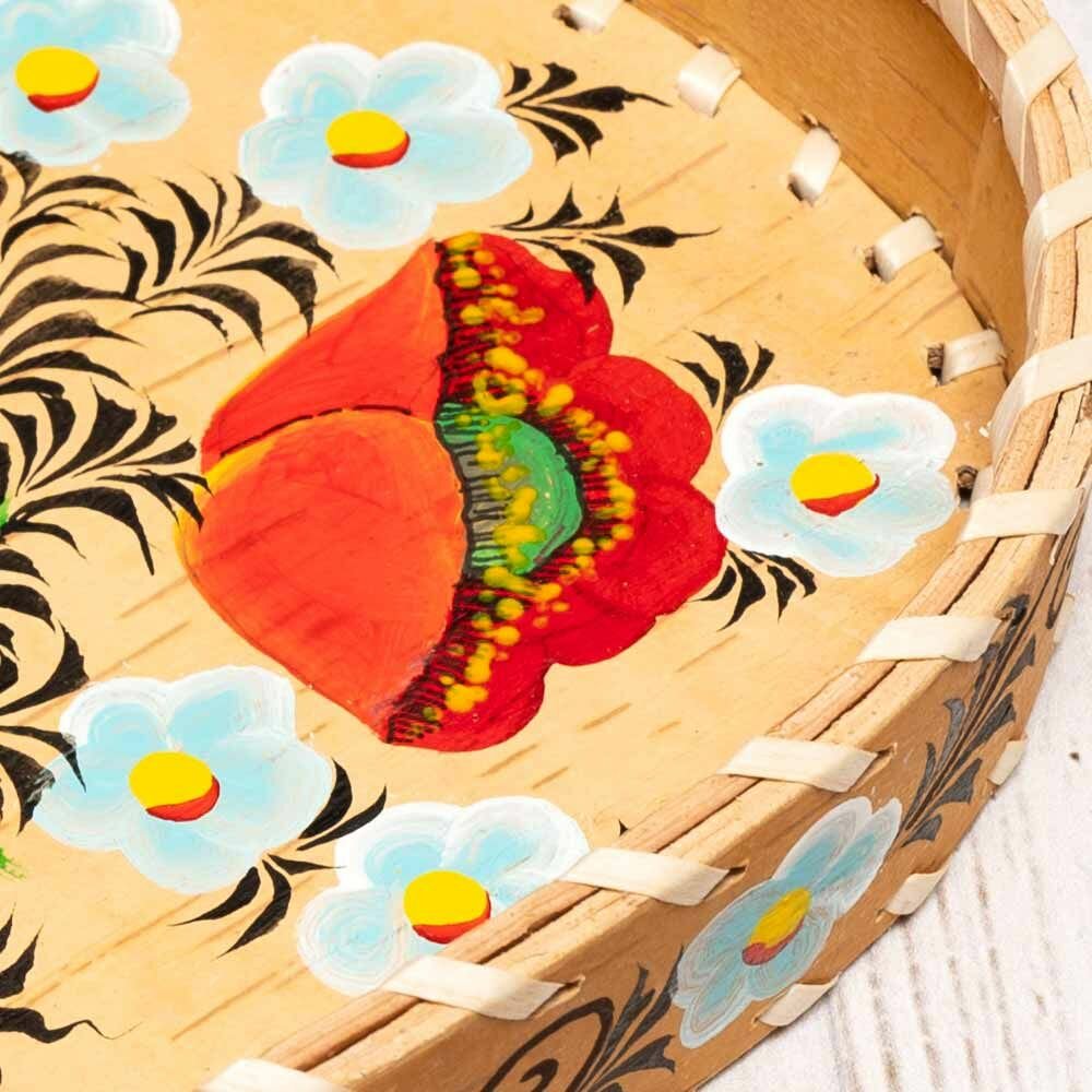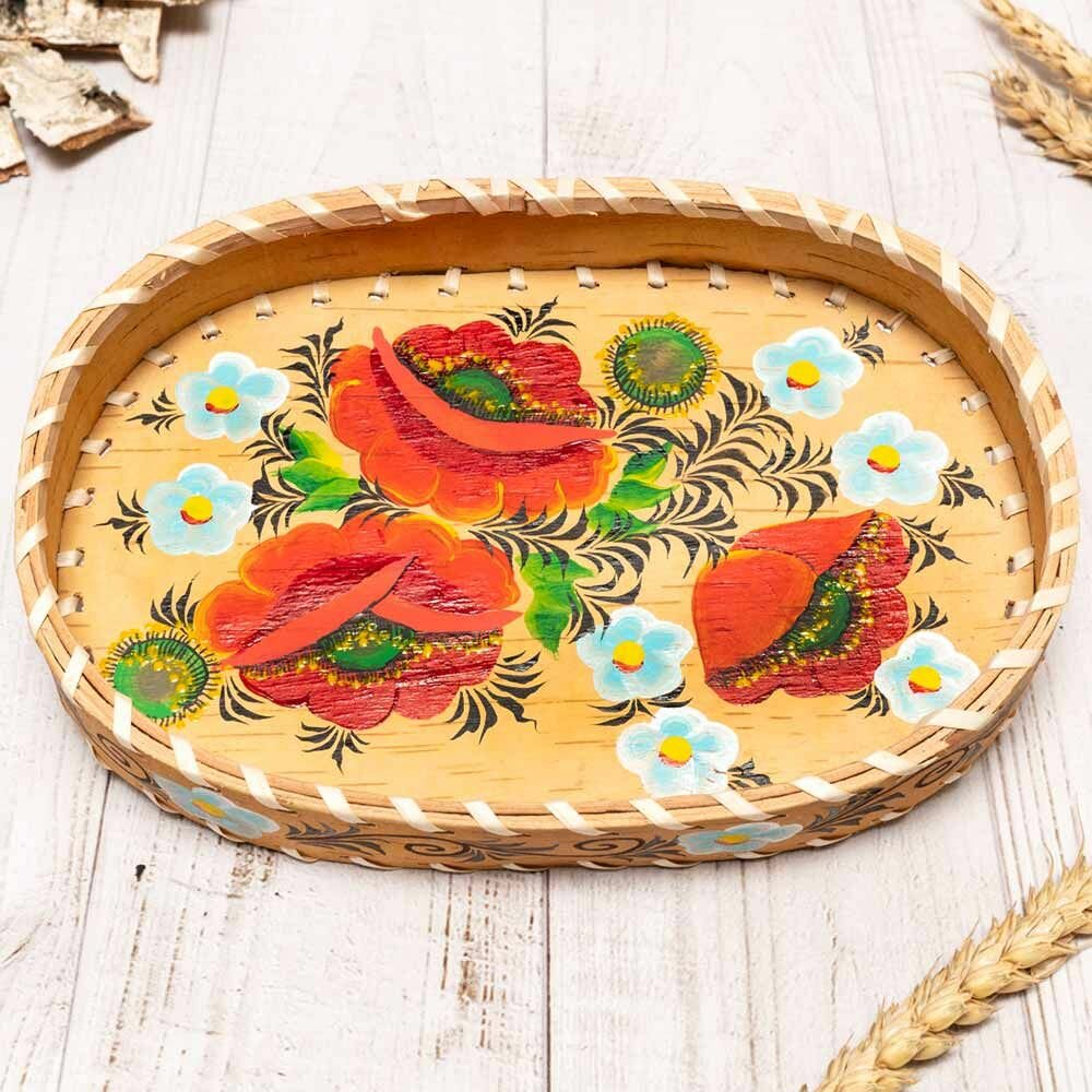 Тарелка - Сухарница Цветы, роспись, береста, 22х15х3,5 см интересное: