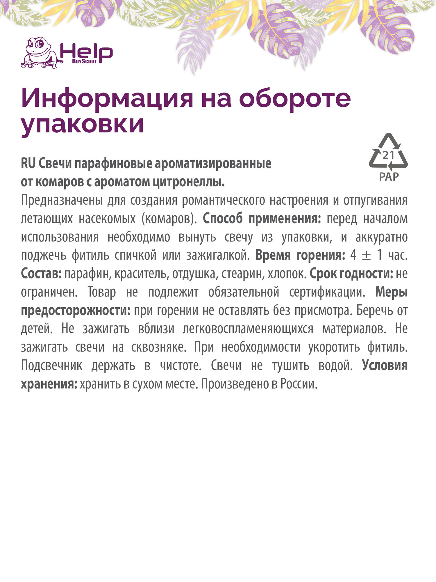 HELP Свечи чайные от комаров, c ароматом цитронеллы, 12 шт. в уп. интересное: