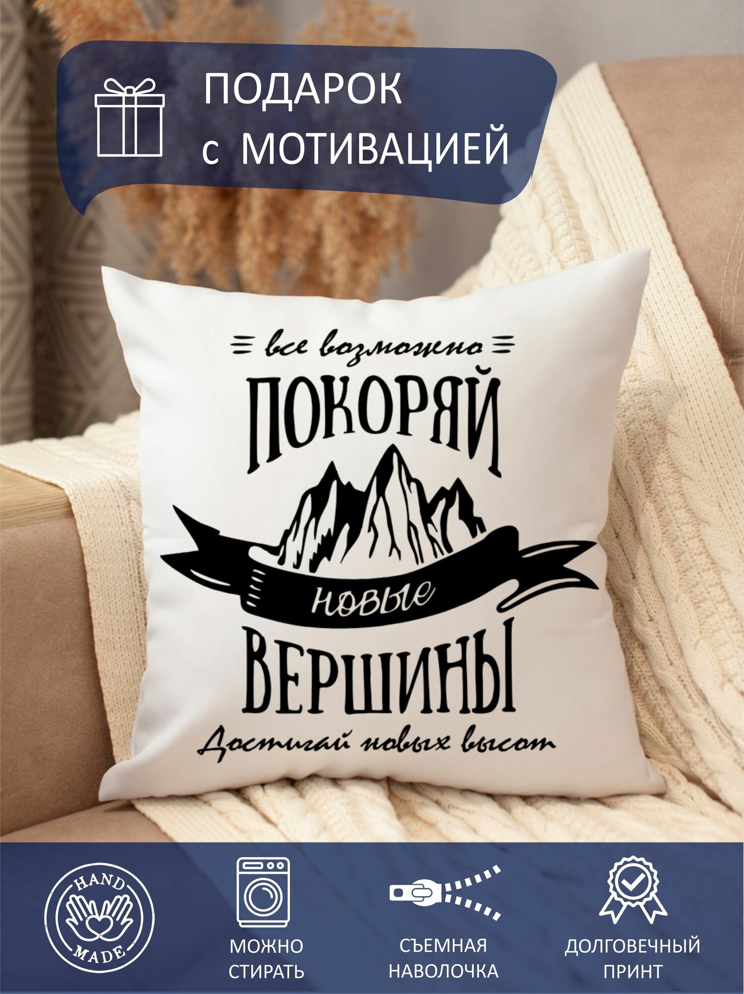 Подушка декоративная мотивация, с принтом покоряй вершины, диванная, 35 x 35 см, съемная наволочка, на молнии интересное: