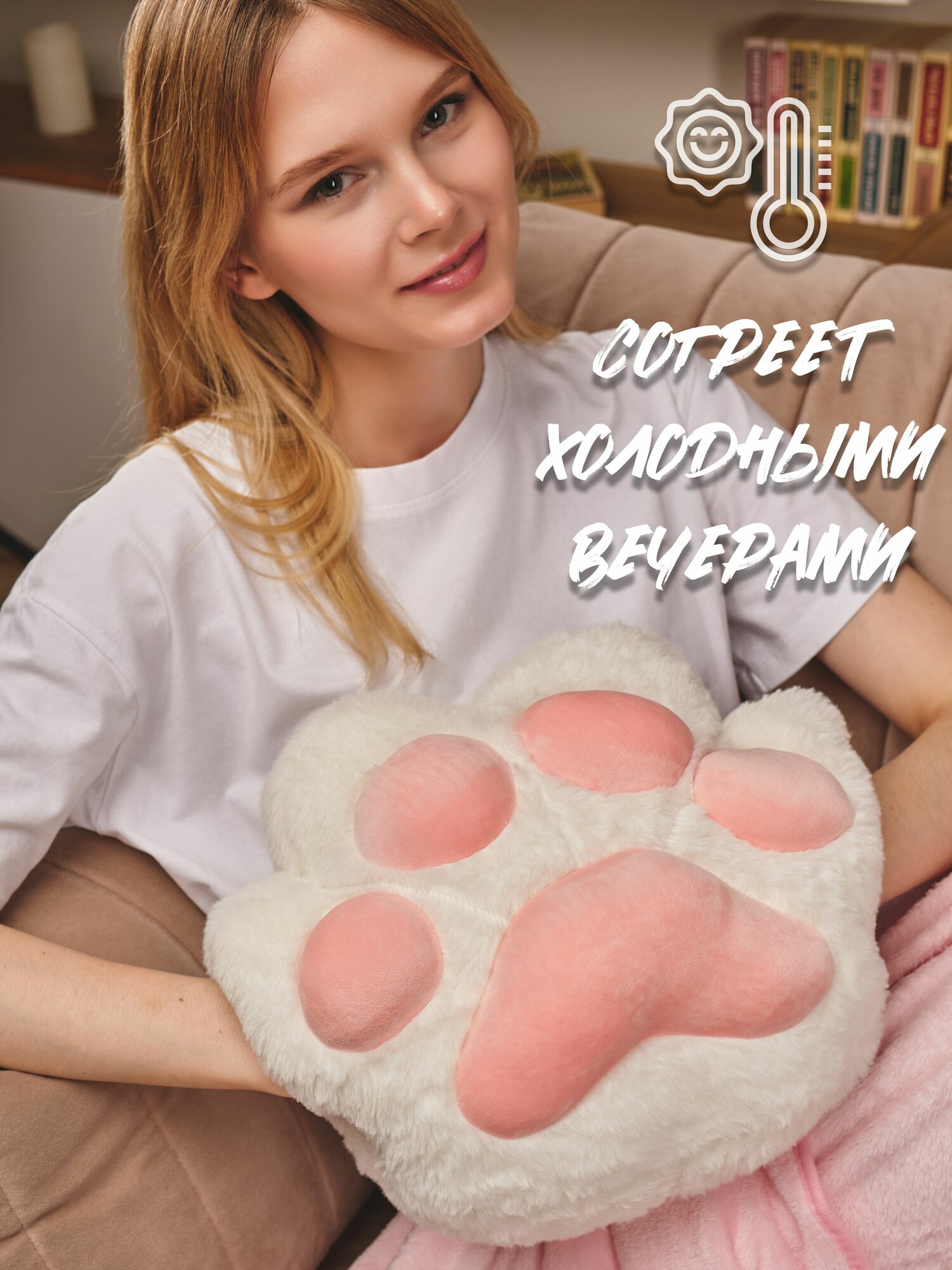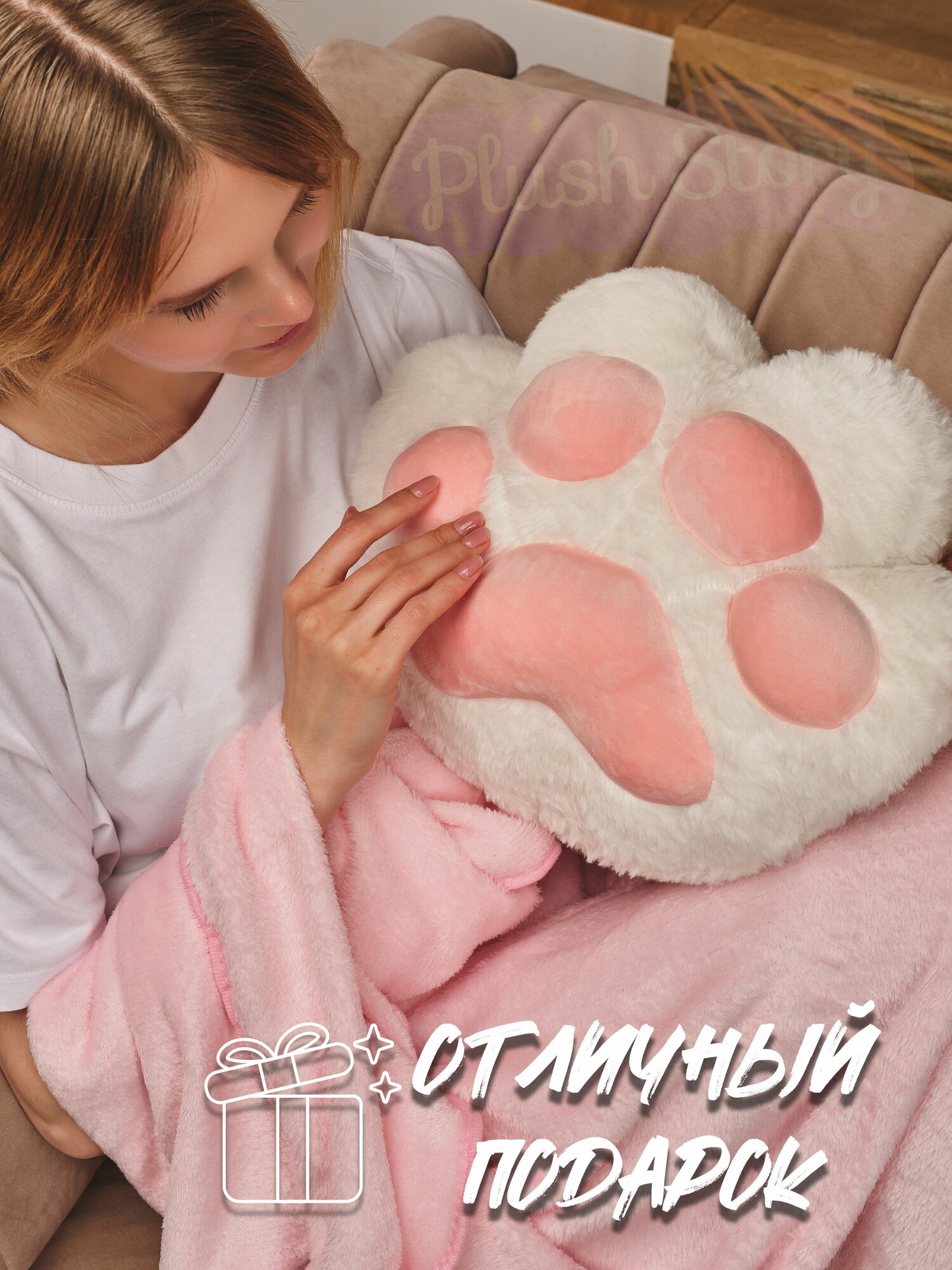 Подушка декоративная для сна Обнимашка Сидушка на стул "Кошачья лапка" с пледом белая интересное: