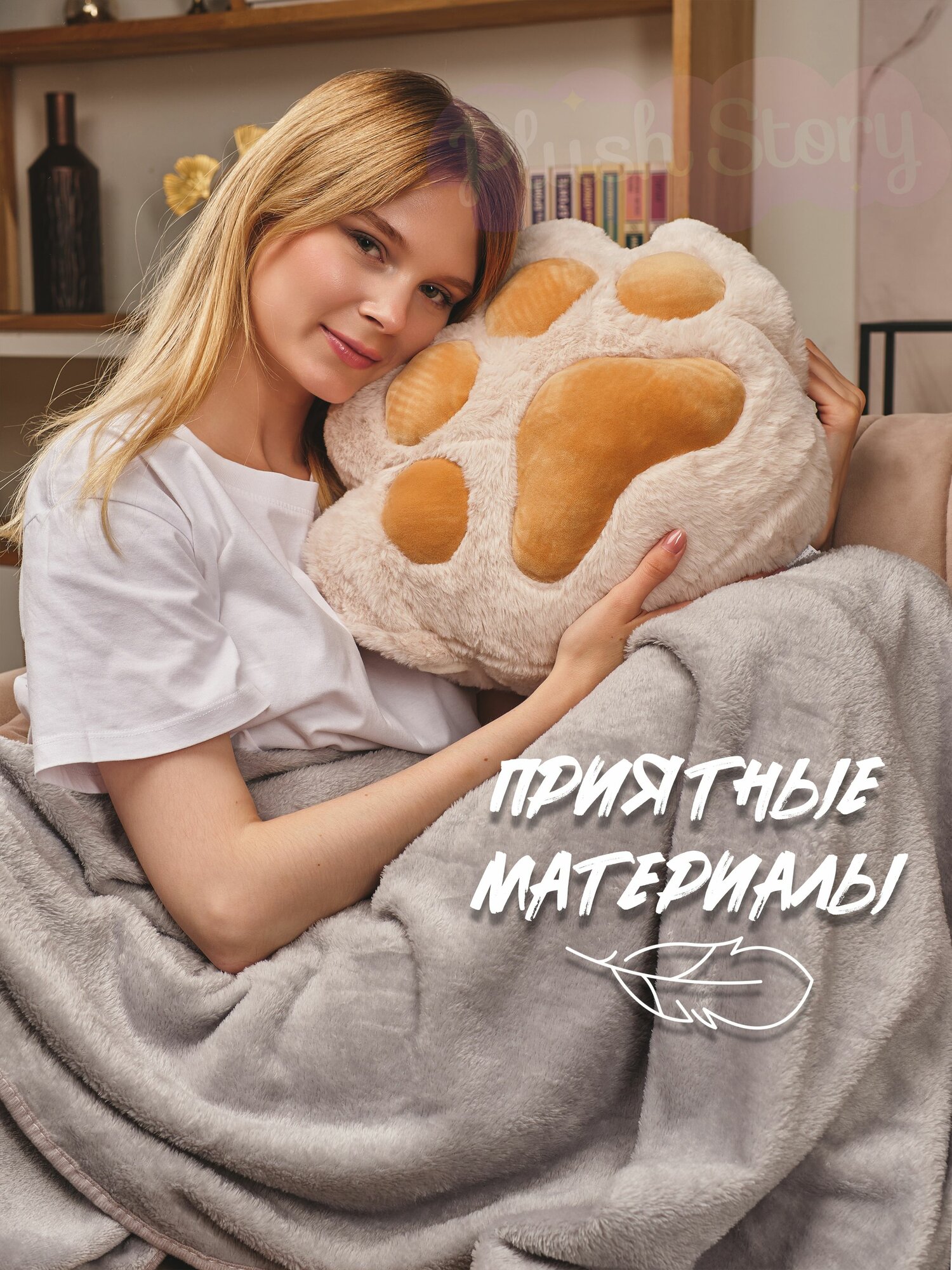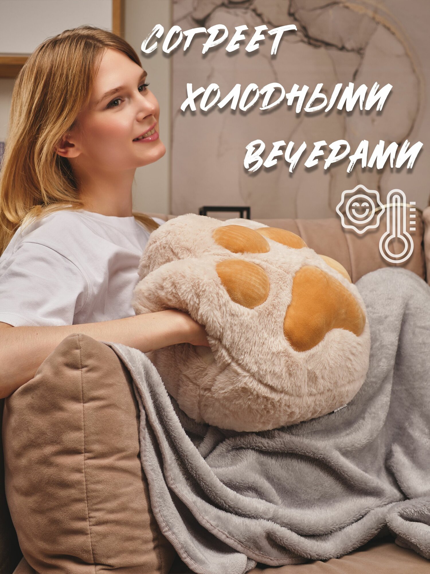 Подушка декоративная для сна Обнимашка Сидушка на стул "Кошачья лапка" с пледом бежевая интересное: