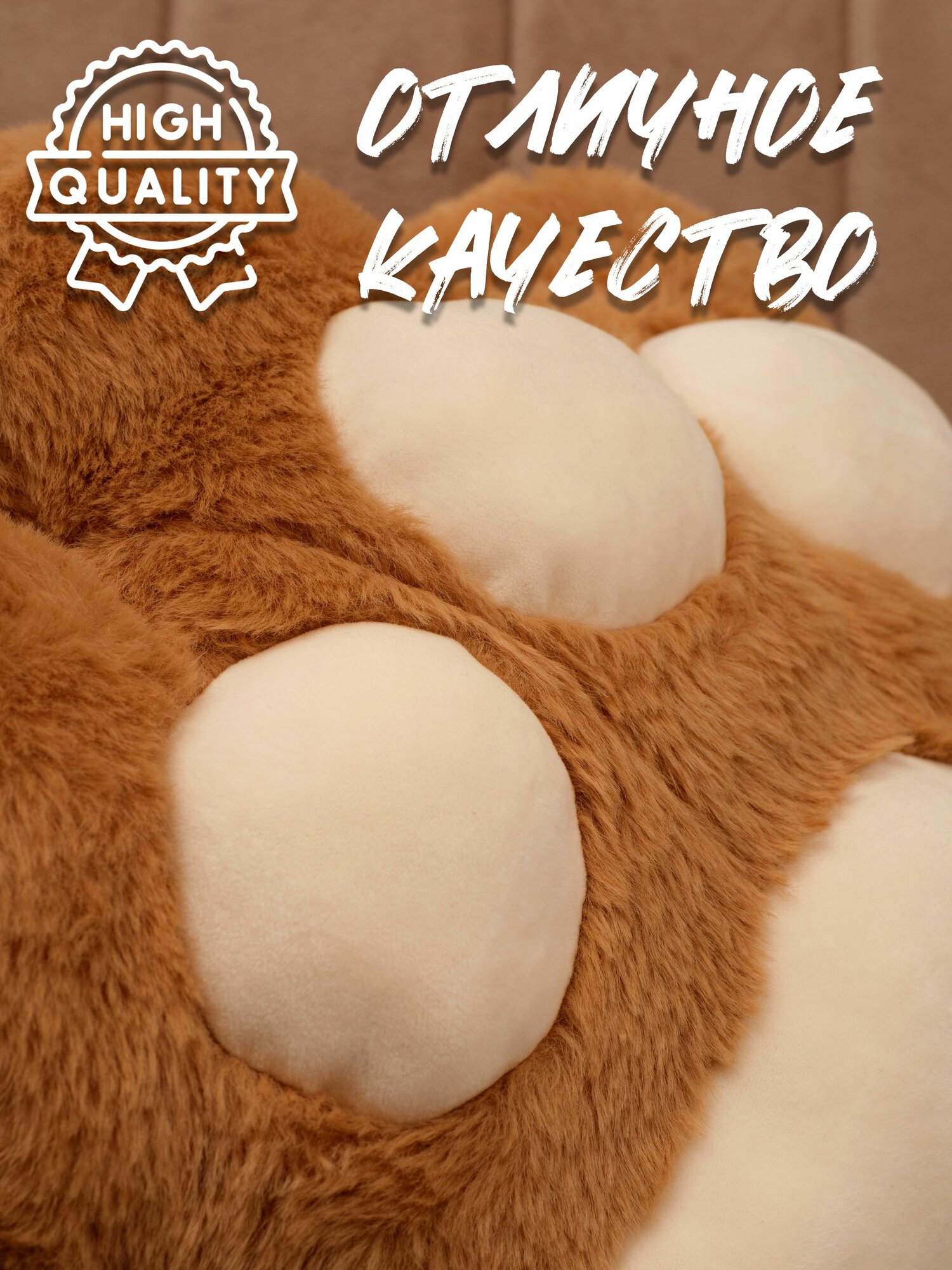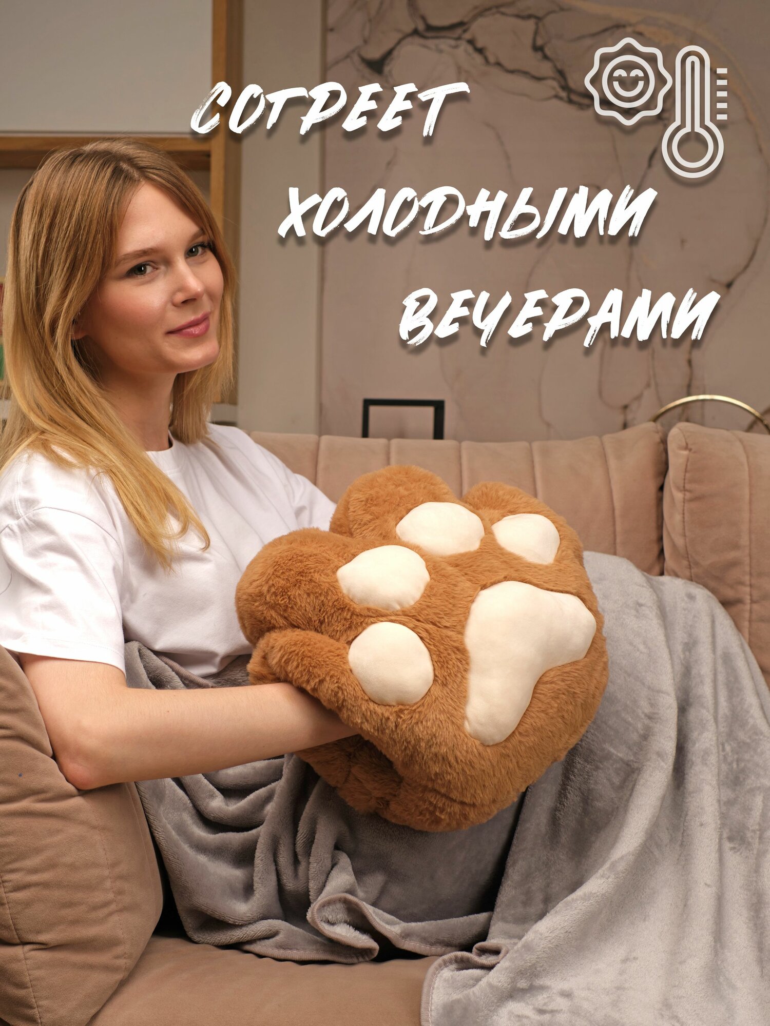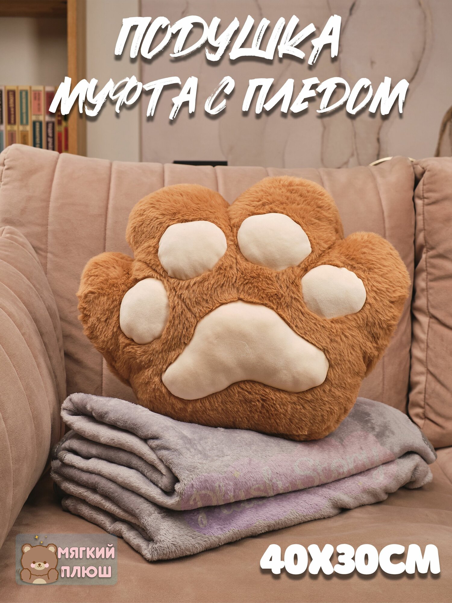 Подушка декоративная для сна Обнимашка Сидушка на стул "Кошачья лапка" с пледом коричневая интересное: