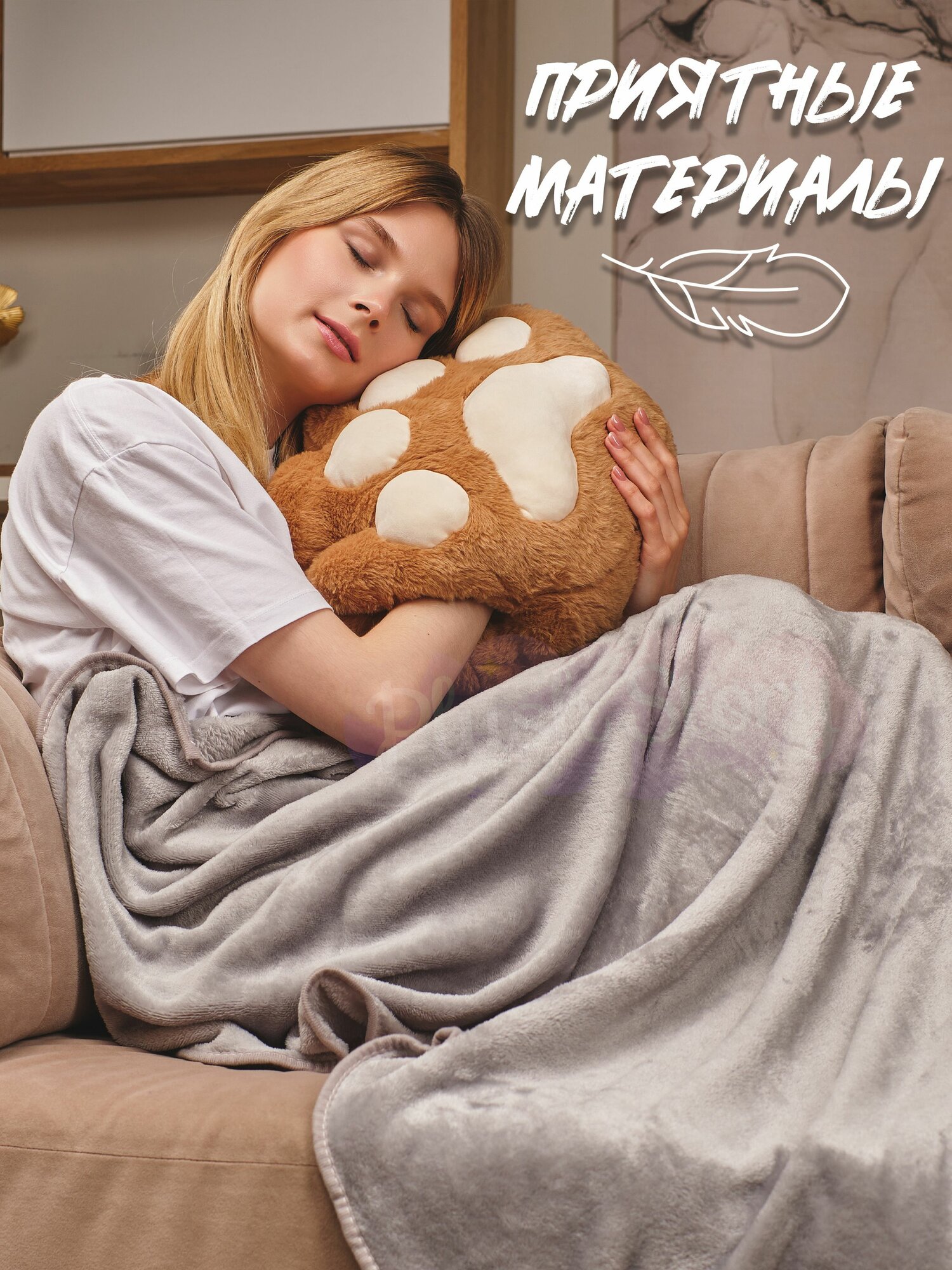 Подушка декоративная для сна Обнимашка Сидушка на стул "Кошачья лапка" с пледом бежевая