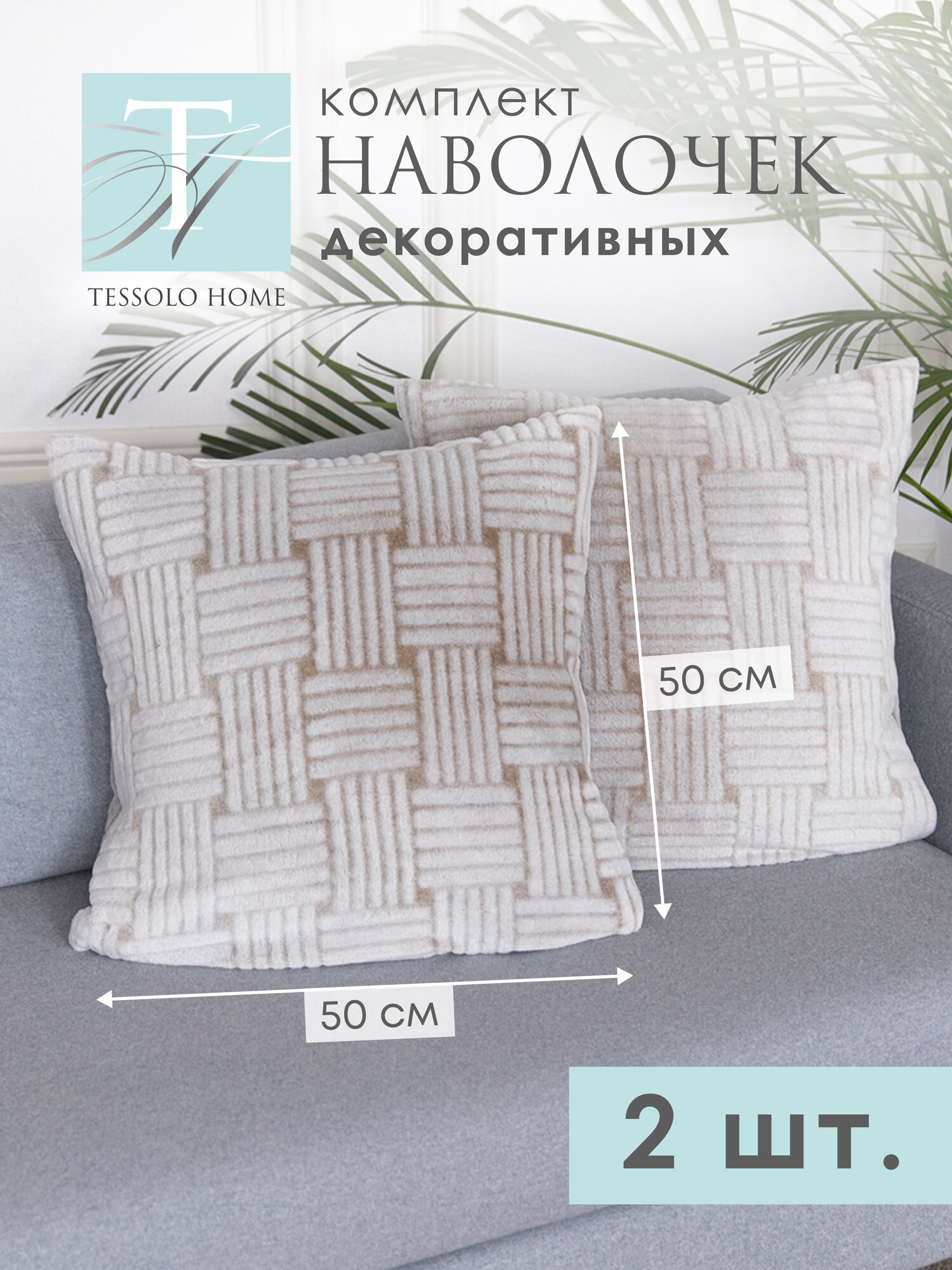 Декоративные наволочки 50х50 , 2 шт, микровелюр, "Жаккард", бежевый