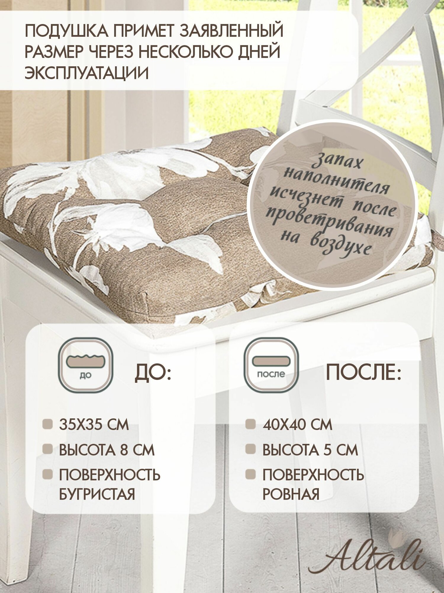 Подушка на стул /40*40 см /на завязках /ткань хлопок /для кухни, зала, гостиной, беседки/ Жасмин / Altali