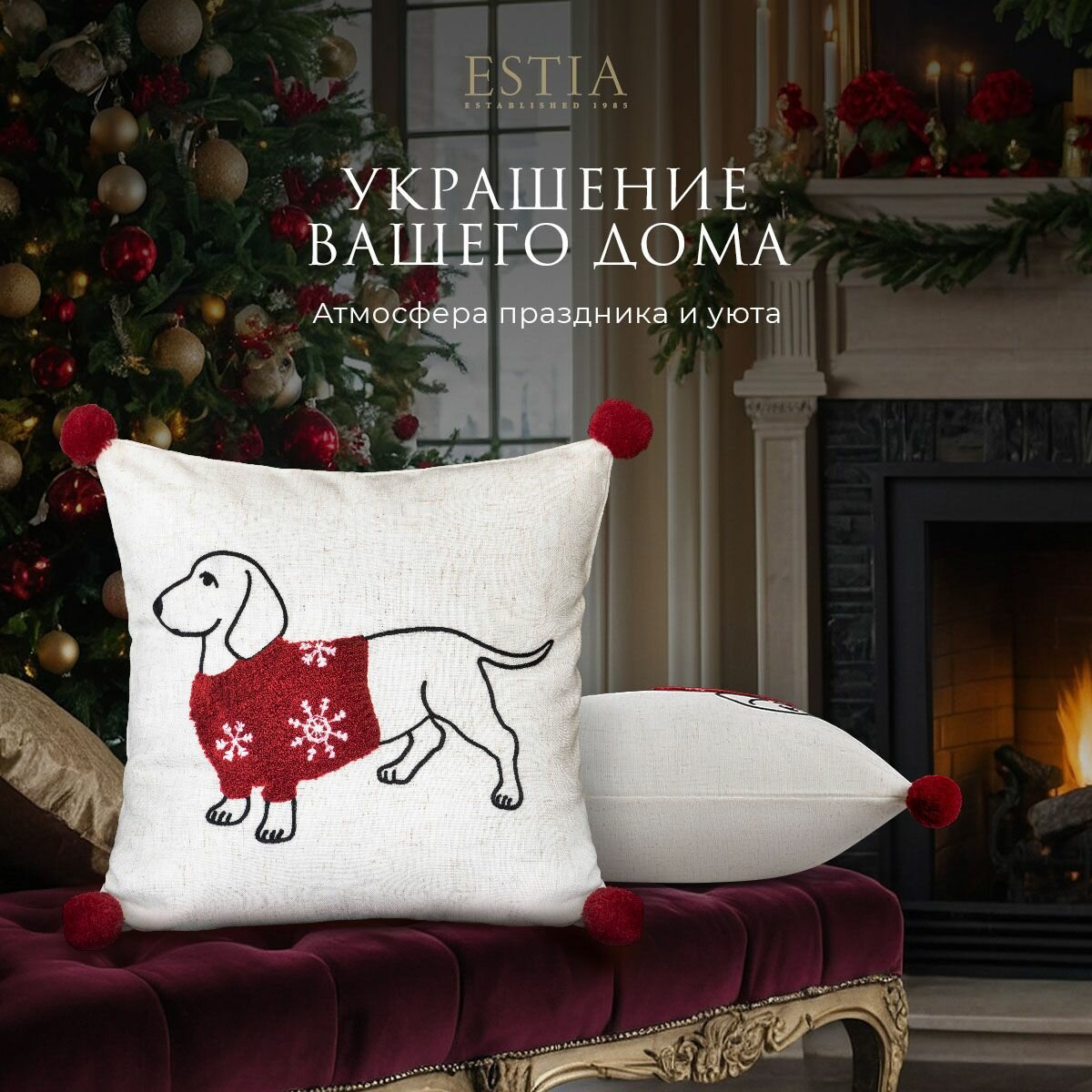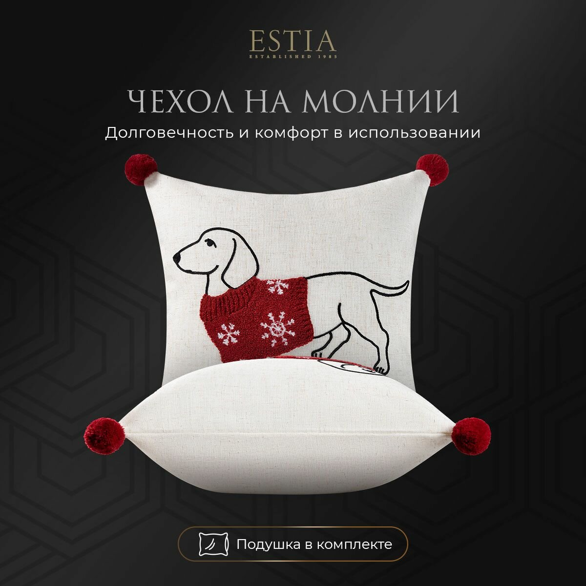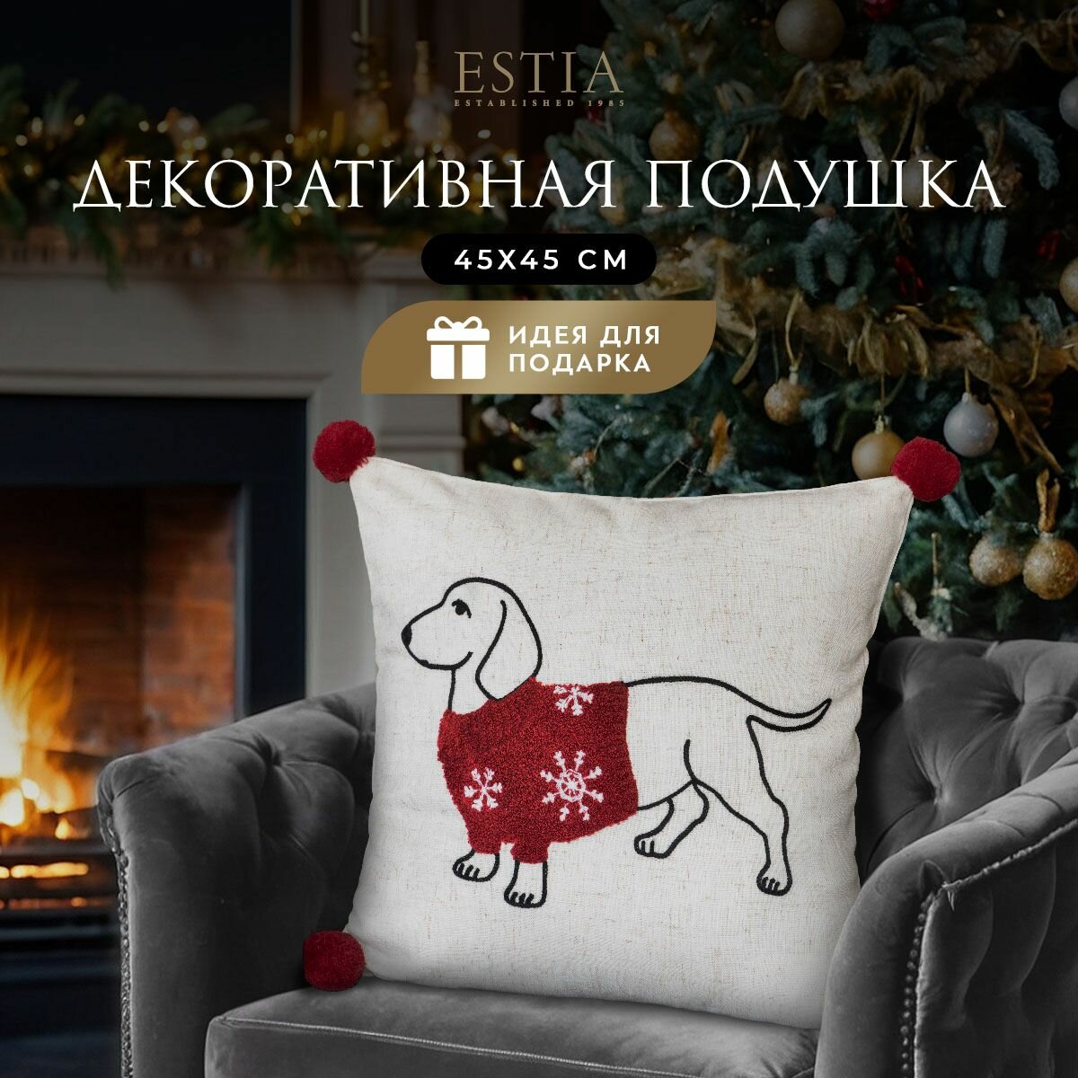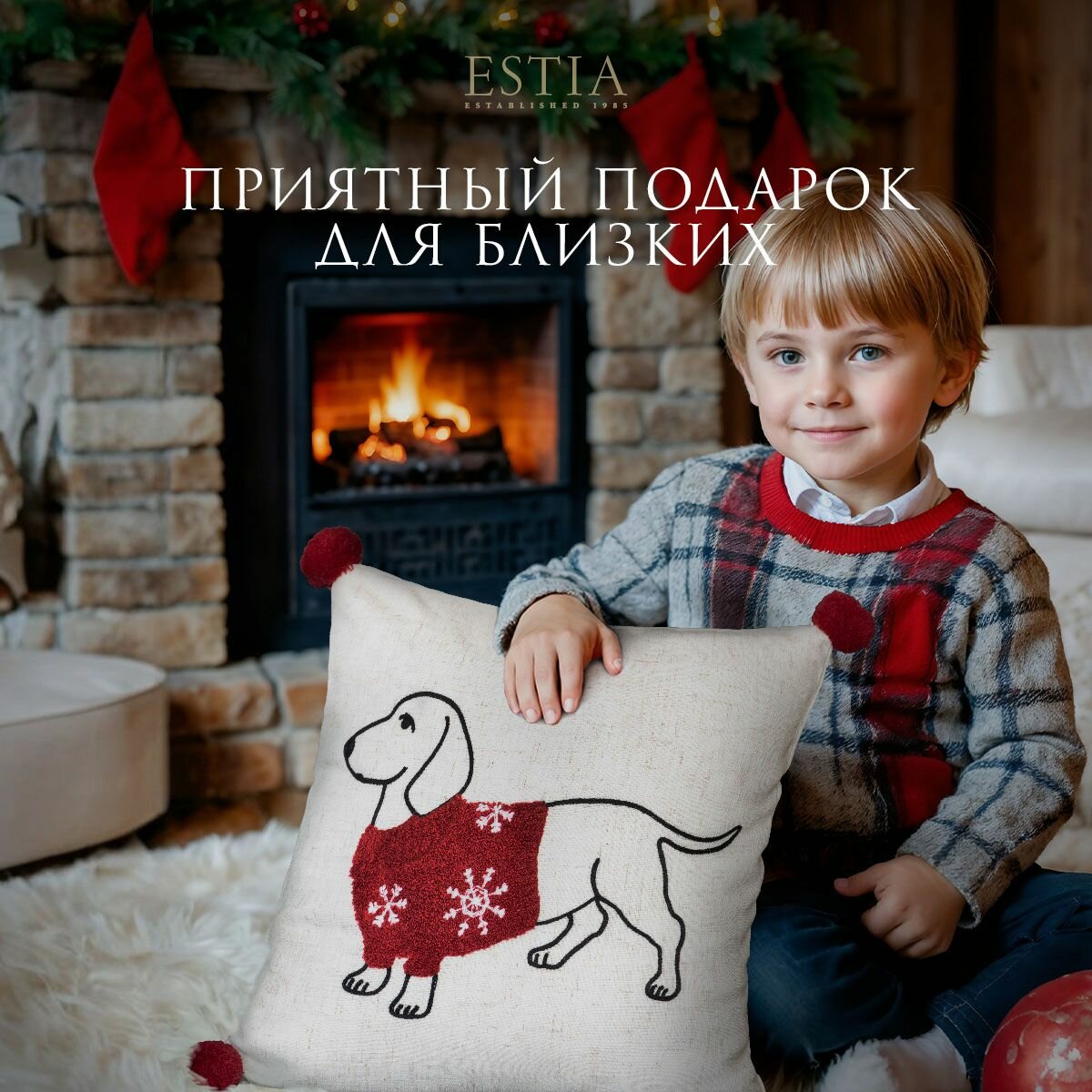 Купить ESTIA Подушка декоративная в подарок "Канэ" с помпонами и вышивкой "Собачка в свитере", 45x45