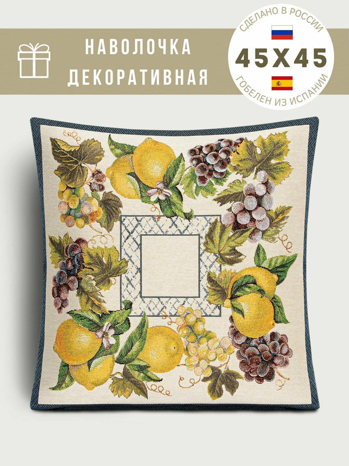 Наволочка декоративная Le Gobelin Жюра Виноград и лимоны синий бордюр 45х45 см интересное: