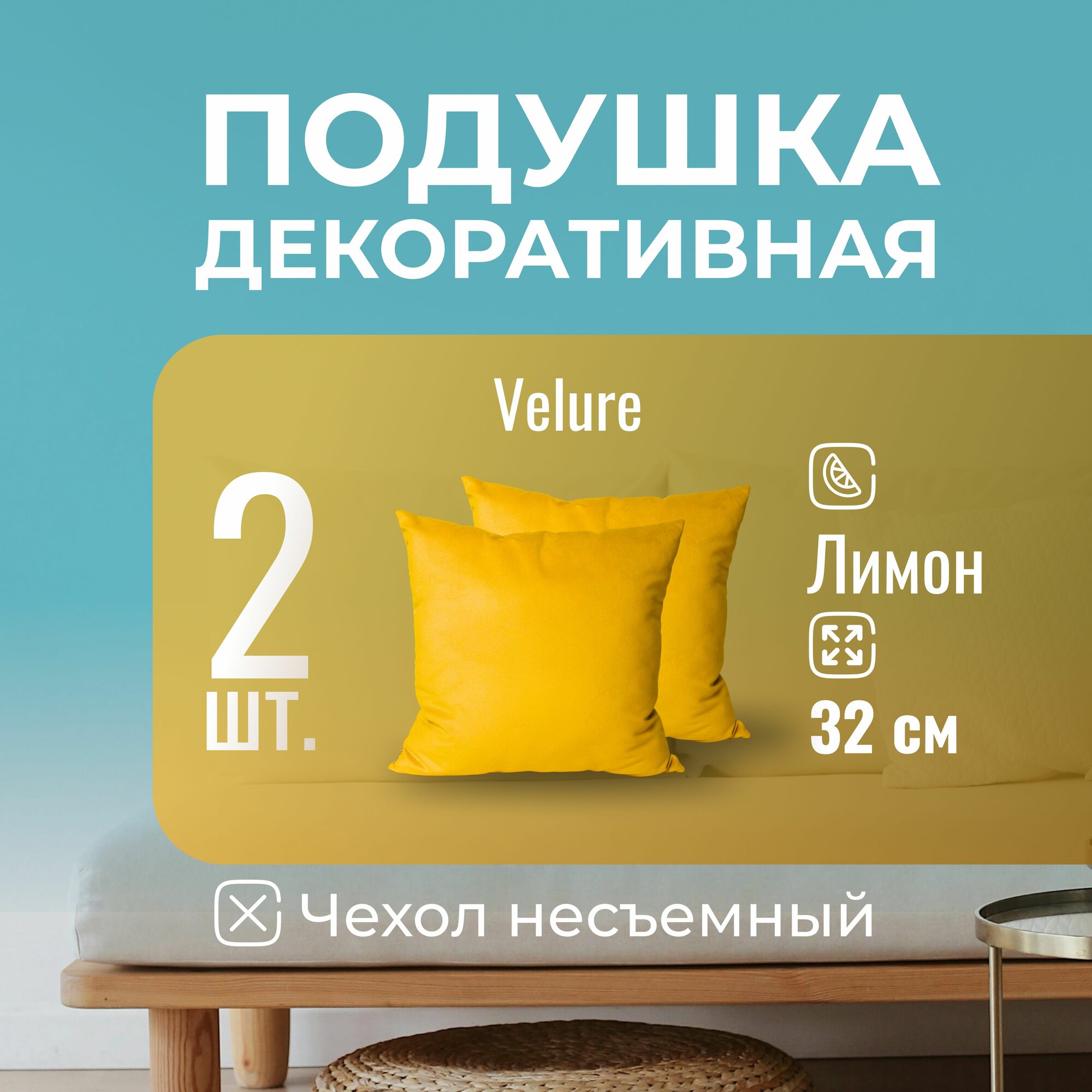 Подушка декоративная / диванная 42 х 42 MINOKO Velure Лимон 2 шт. Съемный чехол