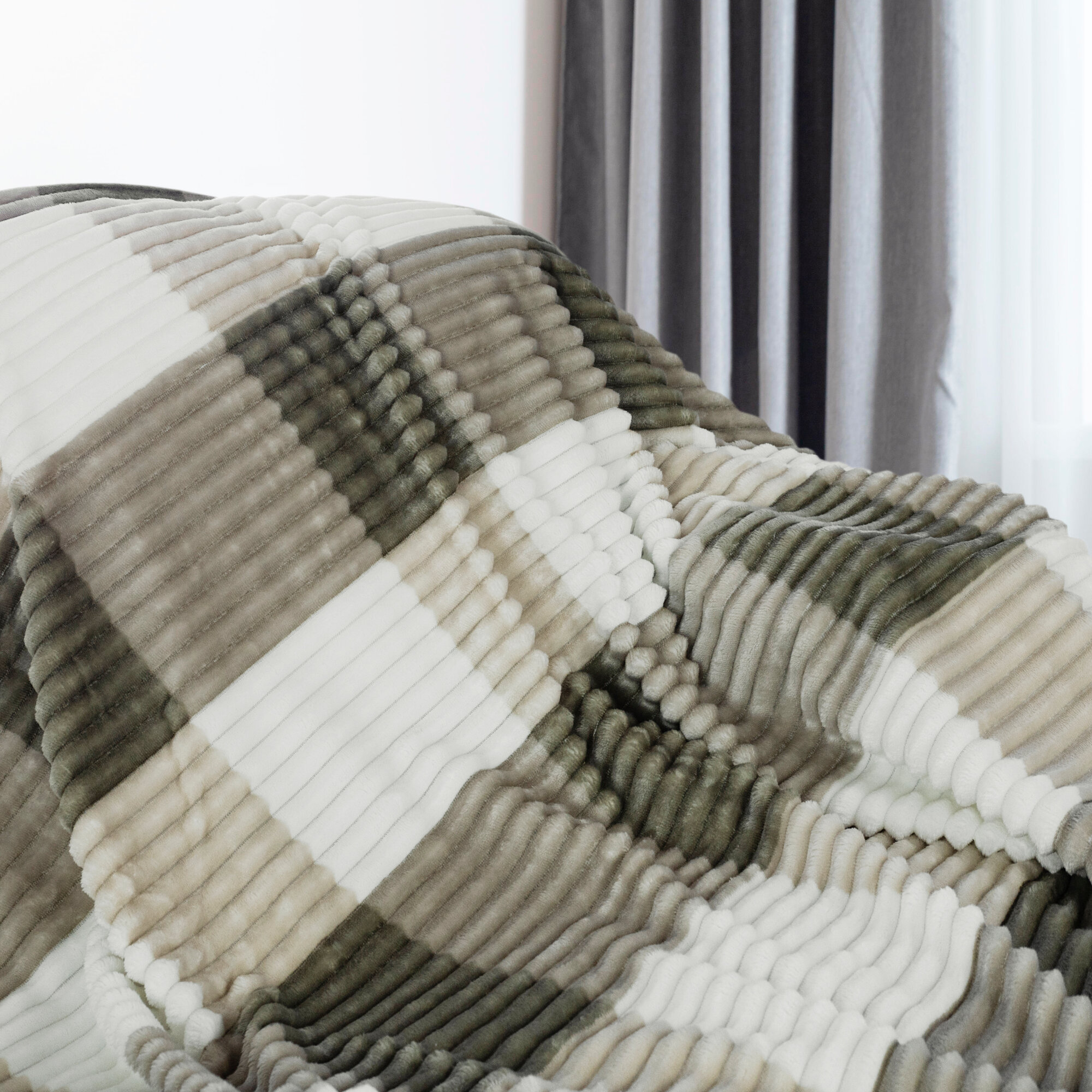 Плед двуспальный 180х200 серо-зеленый в клетку, покрывало на кровать и диван Cleo Orrizonte Print, пушистый велсофт