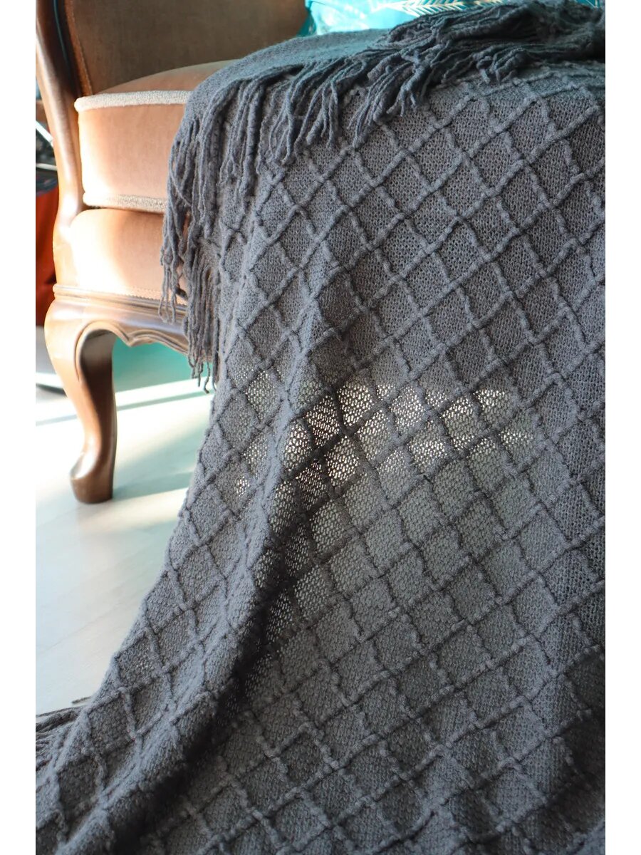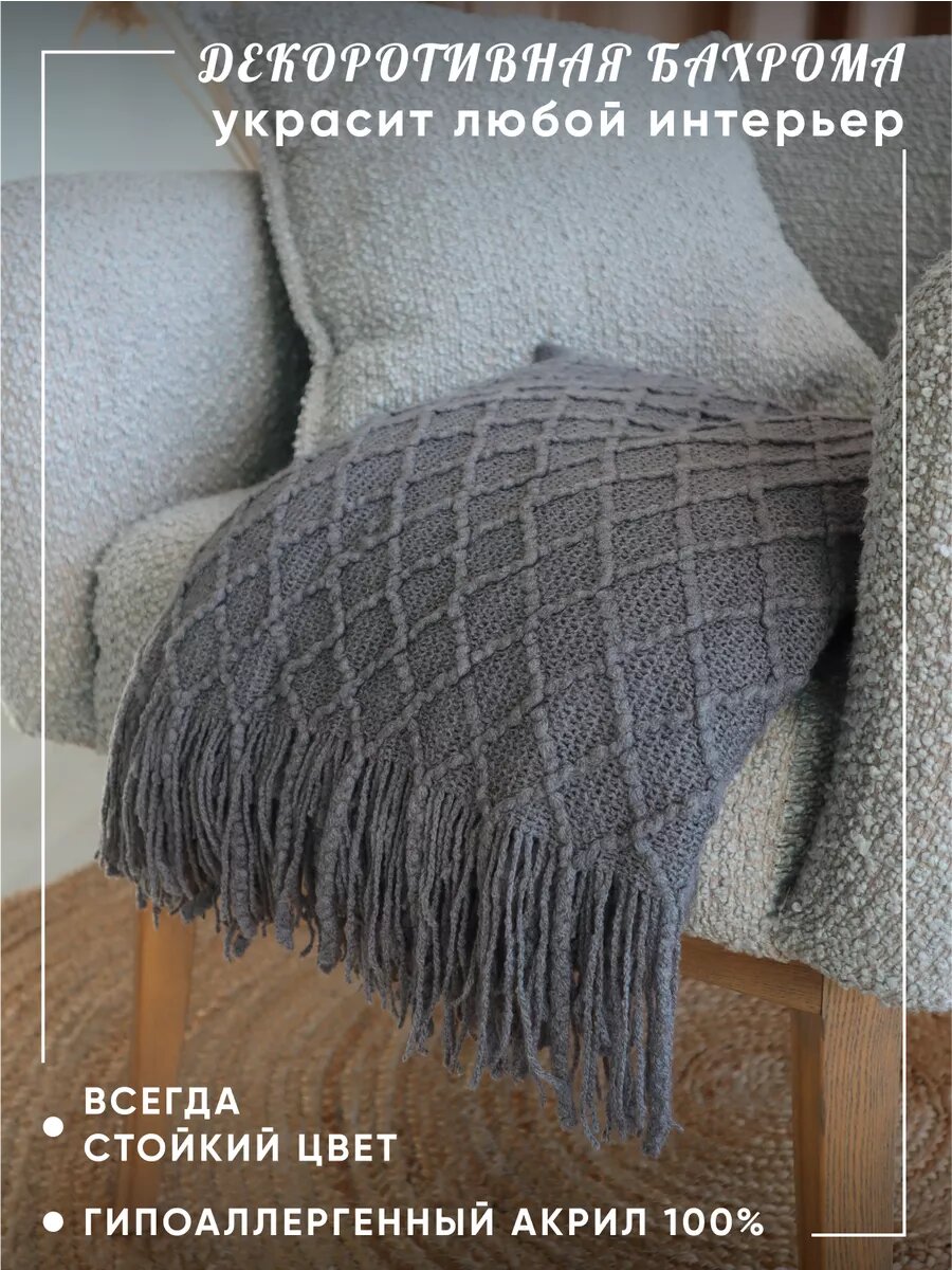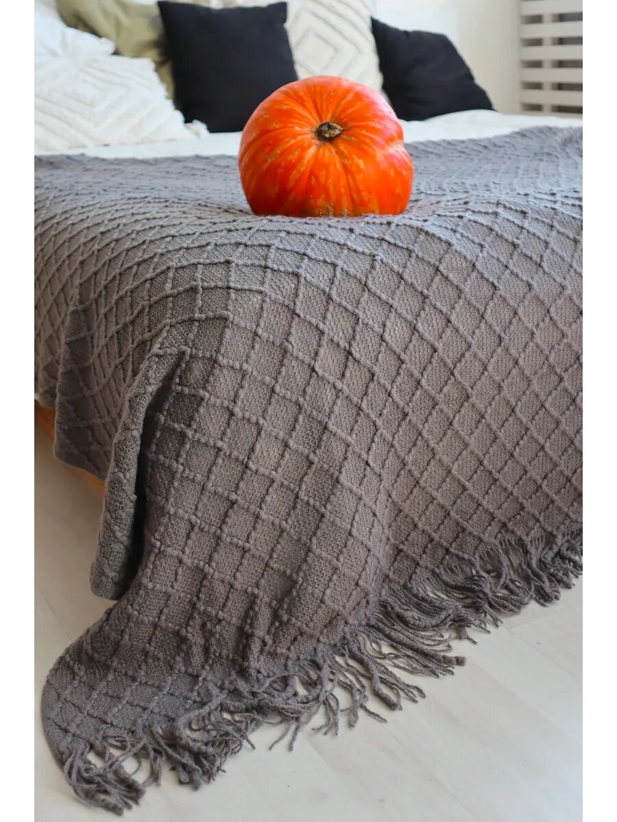 Плед на диван кровать вязаный 127х180 с бахромой, скандинавский стиль, интерьерный интересное: