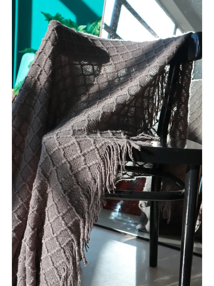 Плед на диван кровать вязаный 130х230 с бахромой, скандинавский стиль, интерьерный