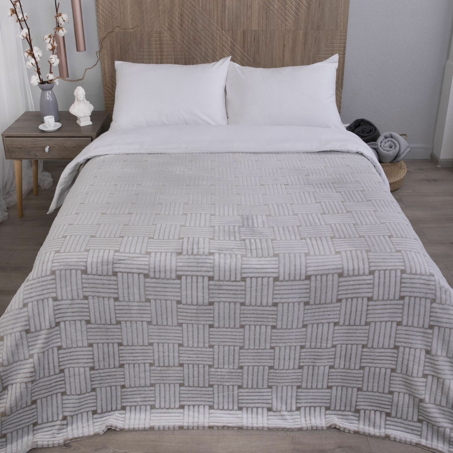 Покрывало 240х260 на кровать диван плюшевое плед, "Жаккард", молочный белый