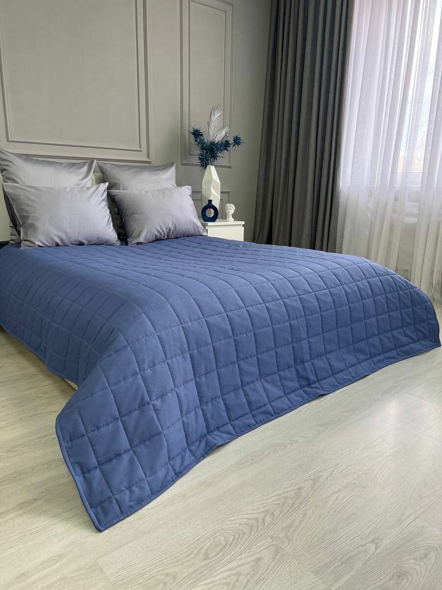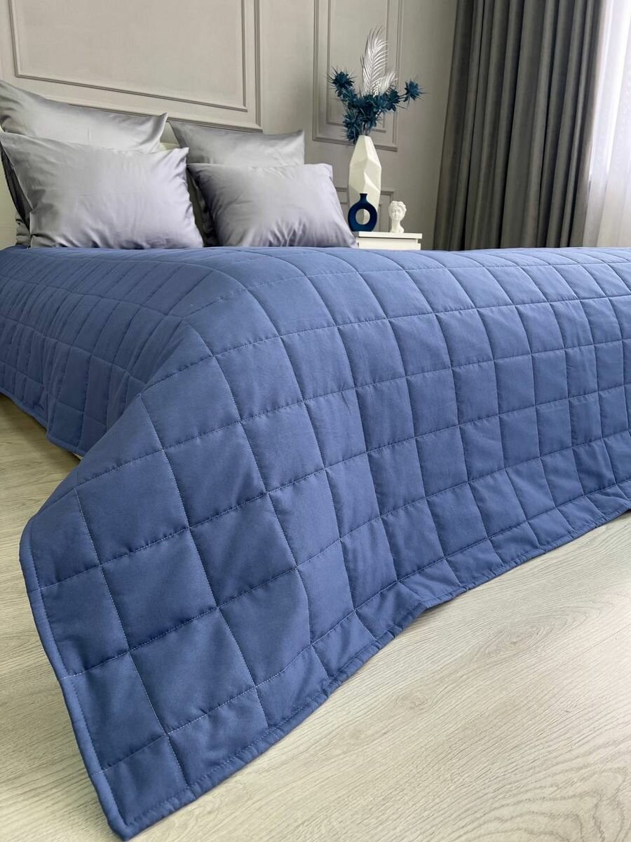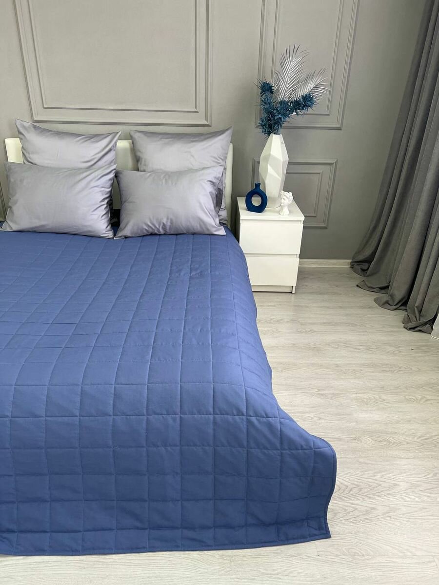 Покрывало на кровать и диван 210х240 см стеганое, синее, Ушки Подушки