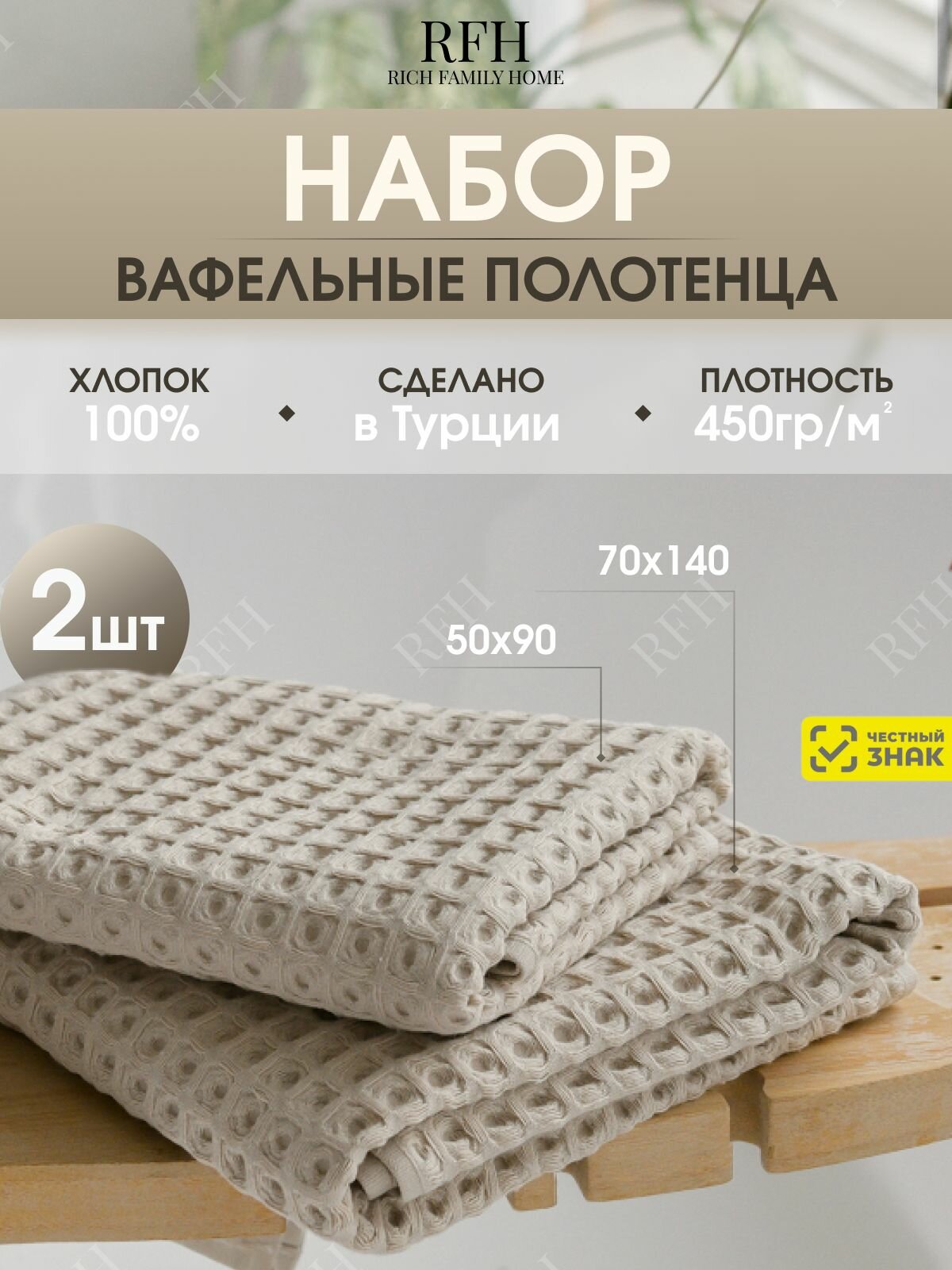 Купить Набор банных полотенец RICH FAMILY HOME, хлопок 100%, вафельные, бежевые, 2шт 70х140 и 50х90