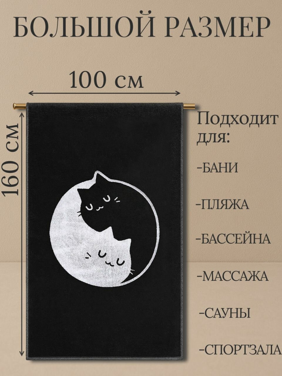 Полотенце банное махровое 100х160 см "Инь-Янь Котики", черно-белое мужское, 100% хлопок, для ванной, пляжа и бани