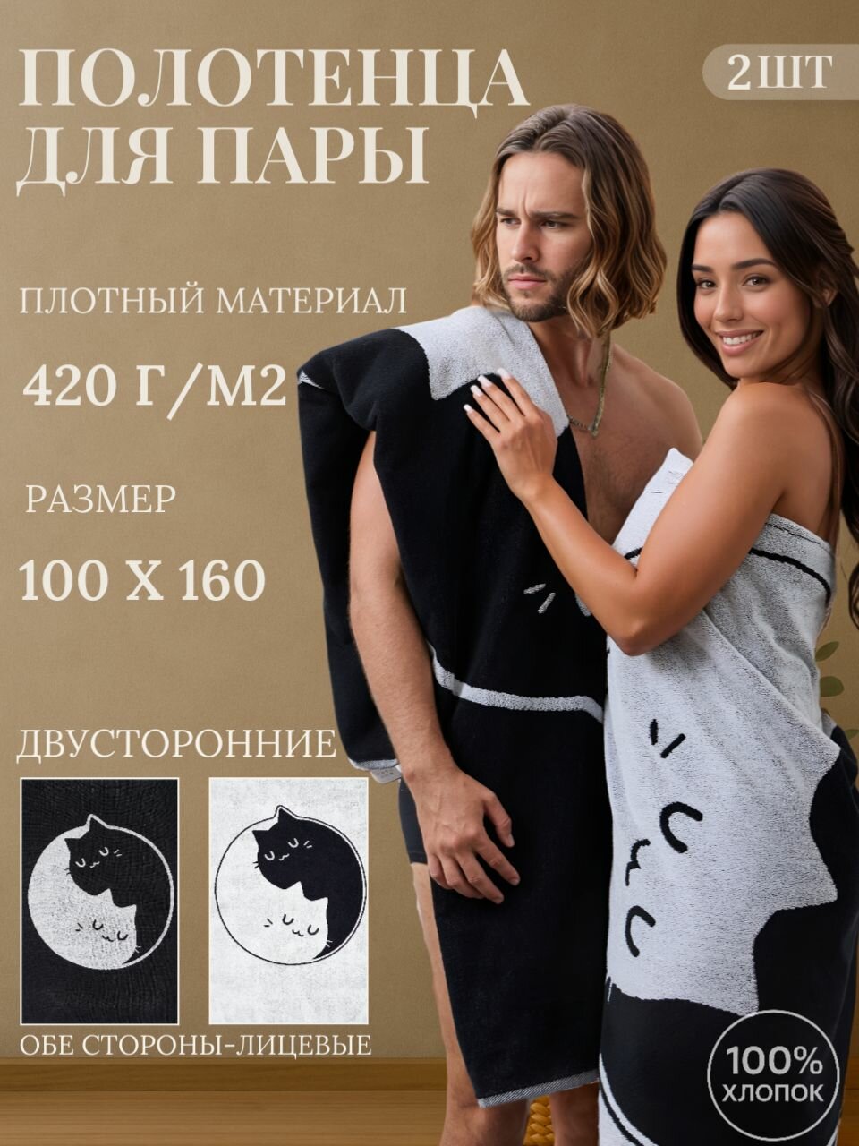 Набор полотенец махровых банных 100х160 см "Инь-Янь Котики", 2 шт (белое и чёрное), 100% хлопок, подарок для пары интересное: