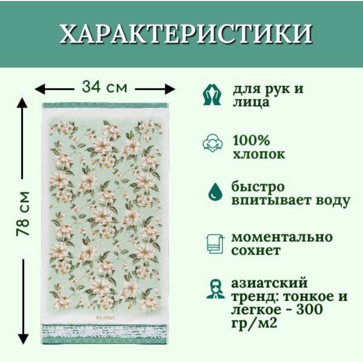 СохранитьПолотенце для лица, рук, махровое полотенце, жасмин, зеленый, 34х78 интересное: