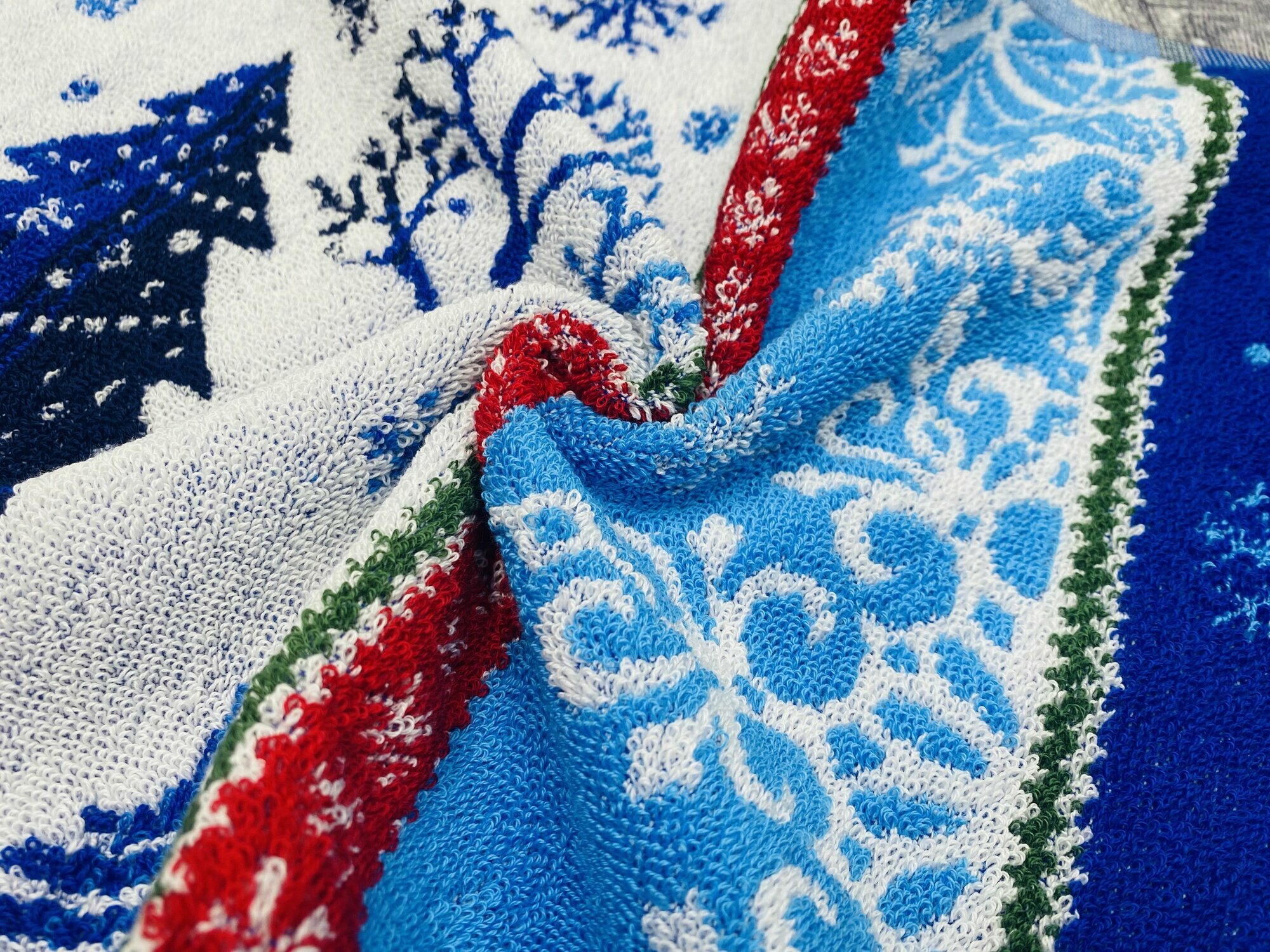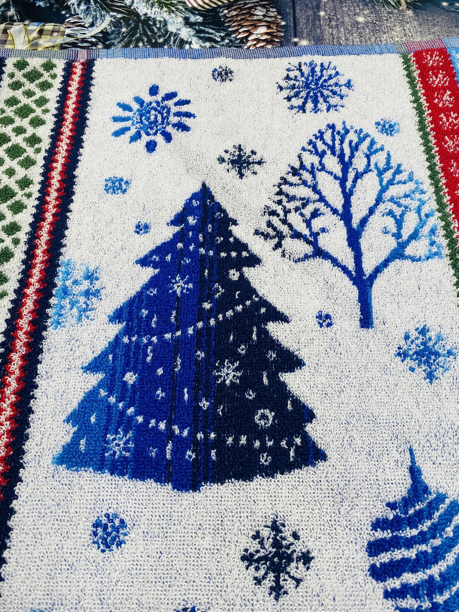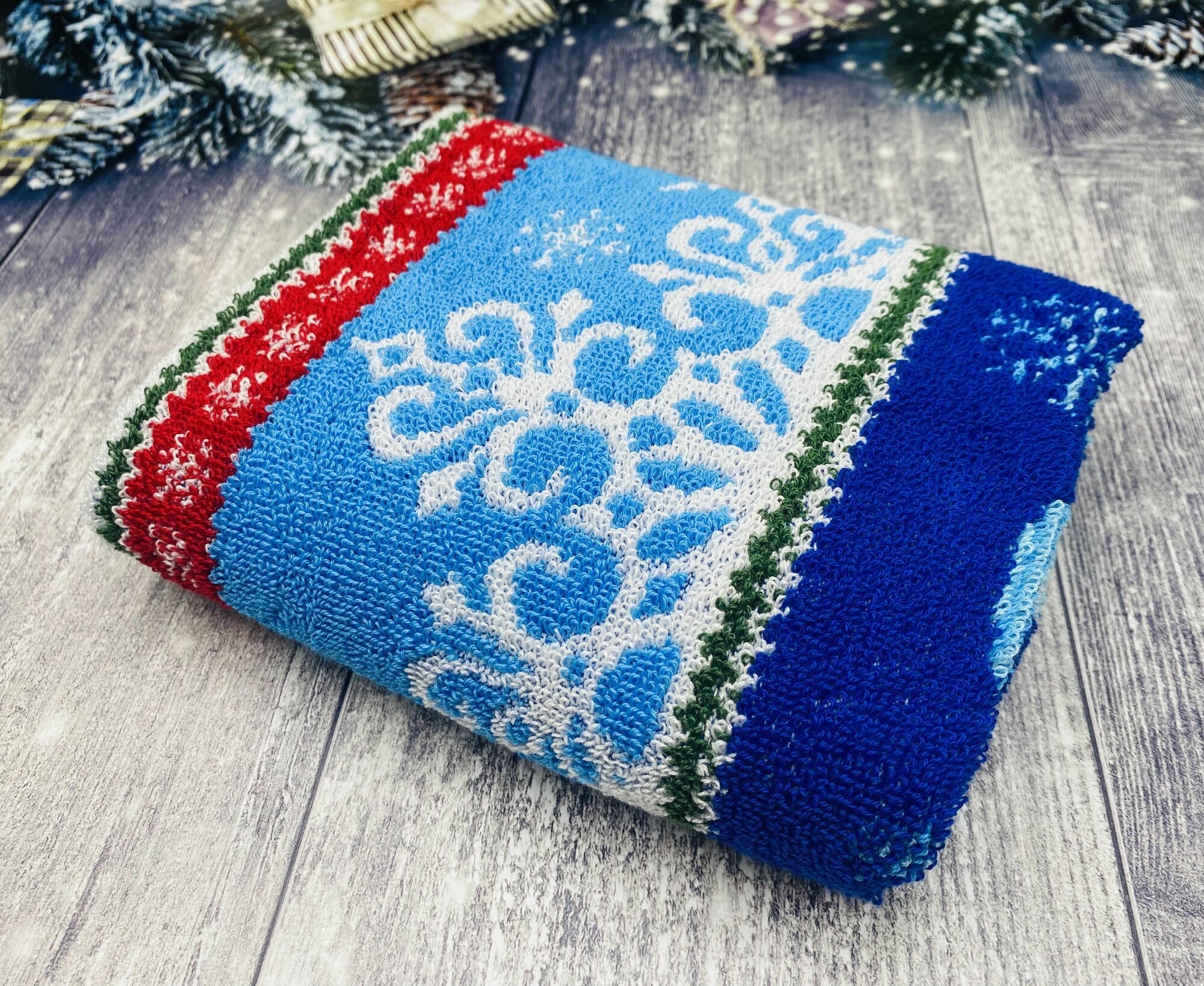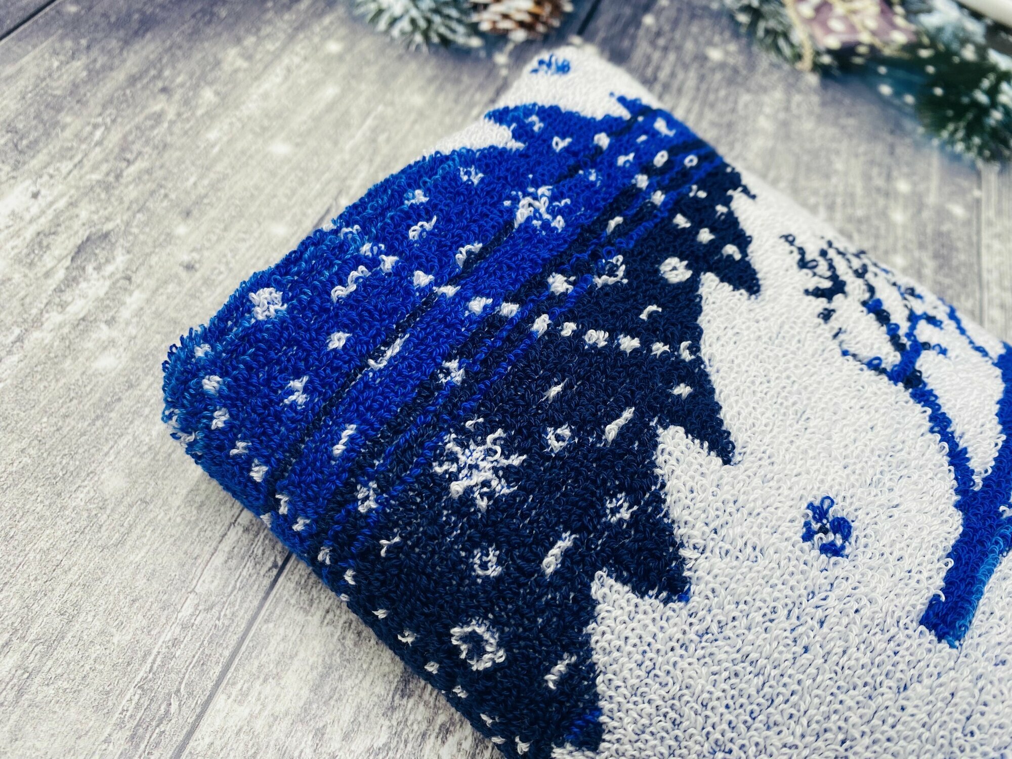 Полотенце махровое ручное, кухонное в подарок на Новый год, Рождество Новогодний орнамент Синее 70*40 см