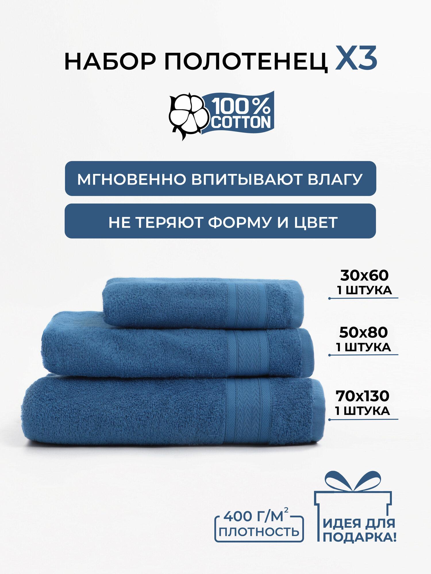 Купить Синий набор № 1204 махровых полотенец 3 шт (30x60 1 шт, 50х80 1 шт, 70x130 1 шт)