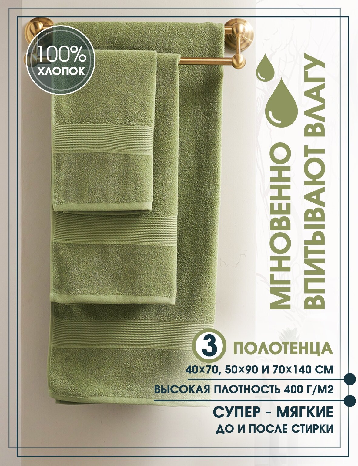 Набор махровых полотенец Winkiki FRH15101 3шт 40x70 50x90 70x140 зеленый интересное: