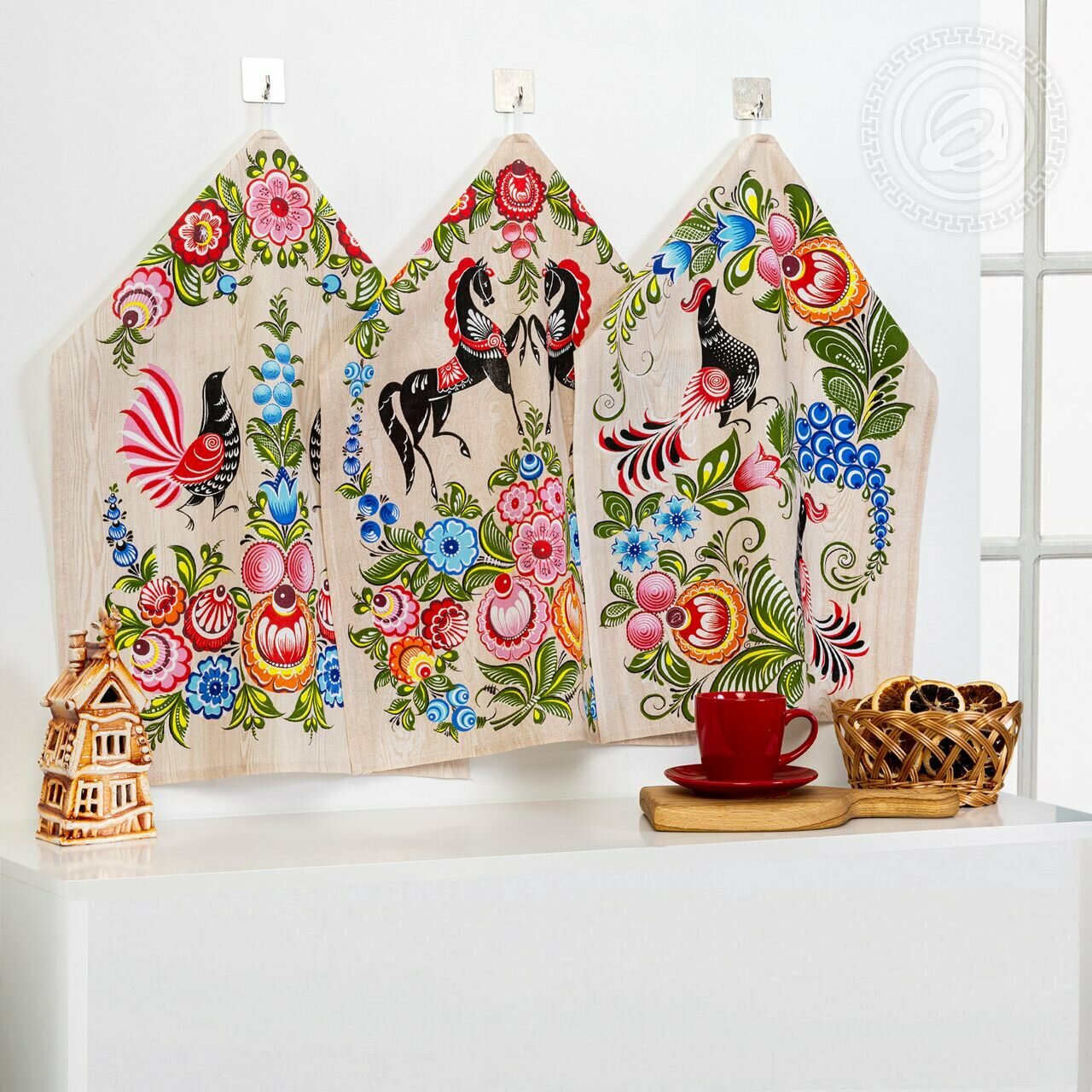 Купить Набор кухонных полотенец «Роспись» - рогожка (3шт - 45*60см), АртПостель, городецкая роспись, цветы, 8 марта