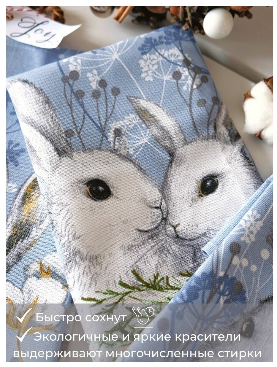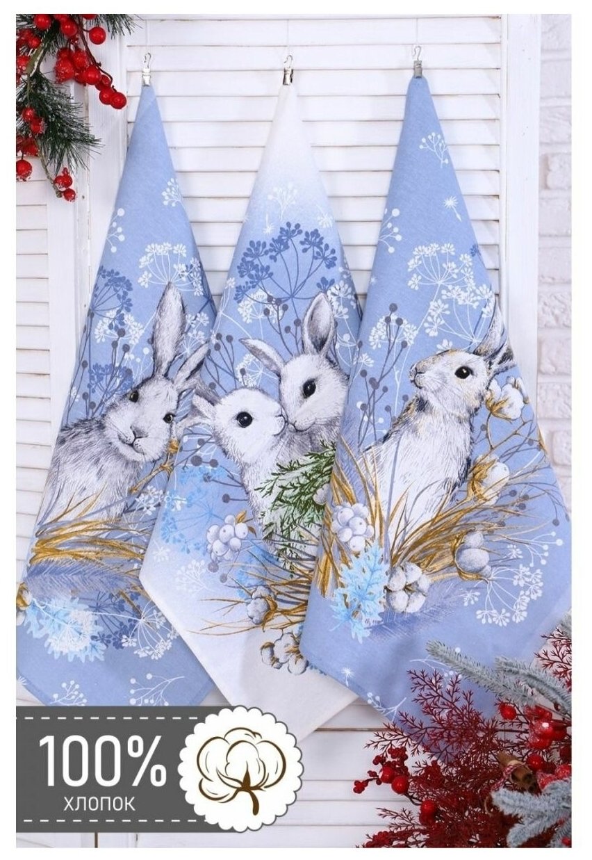 Набор кухонных полотенец - рогожка (3шт - 45*60см), кролик, заяц, голубой