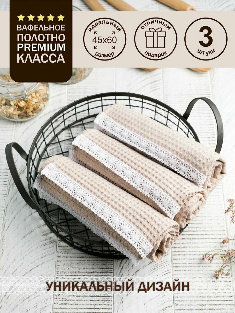 СохранитьПолотенца кухонные набор, вафельные, хлопок, с петелькой, однотонные, декоративные, бежевые, 3 штуки с кружевом 45х60 интересное: