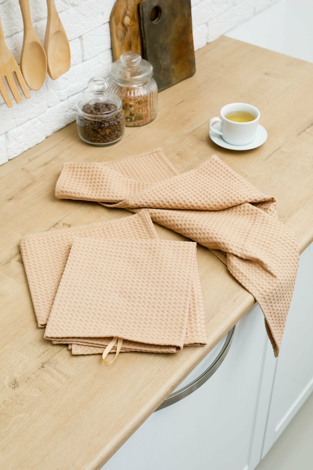 Полотенца кухонные набор, вафельные, хлопок, с петелькой, однотонные, декоративные, бежевые, 3 штуки с кружевом 45х60