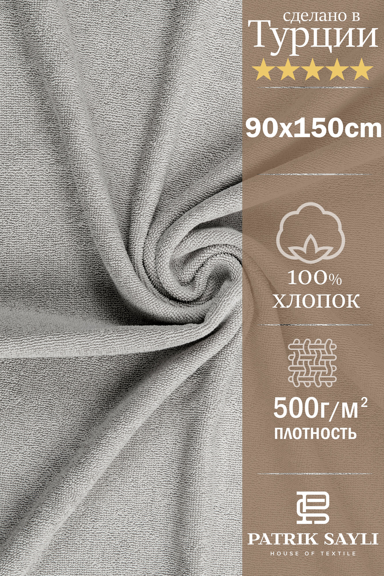 Купить Полотенце банное махровое 90х150 PATRIK SAYLI (100%Хлопок); (серый); (500 гр.) HOTEL
