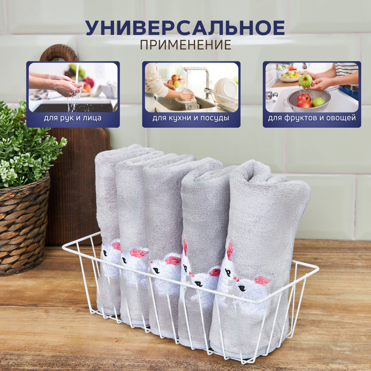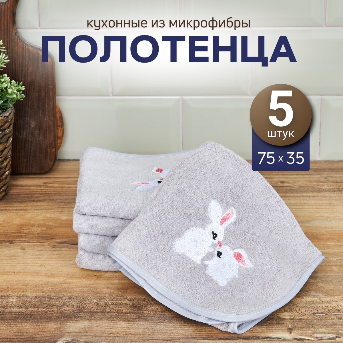 Купить Набор кухонных полотенец MAOMIKO, 5 штук, микрофибра, 35х75 см, серый с вышивкой зайцы