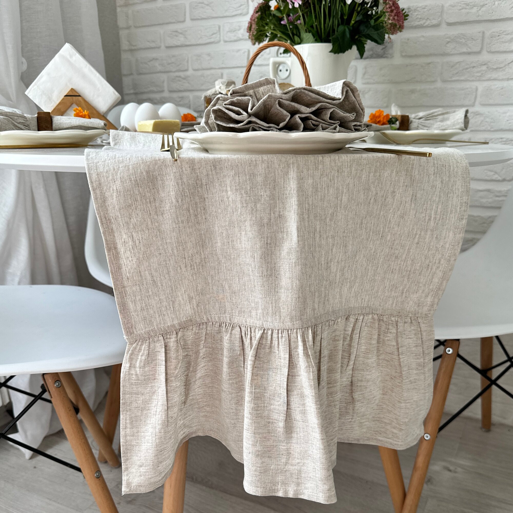Дорожка сервировочная Home Flax, льняная ткань, 210x40 см, бежевая, с рюшами интересное: