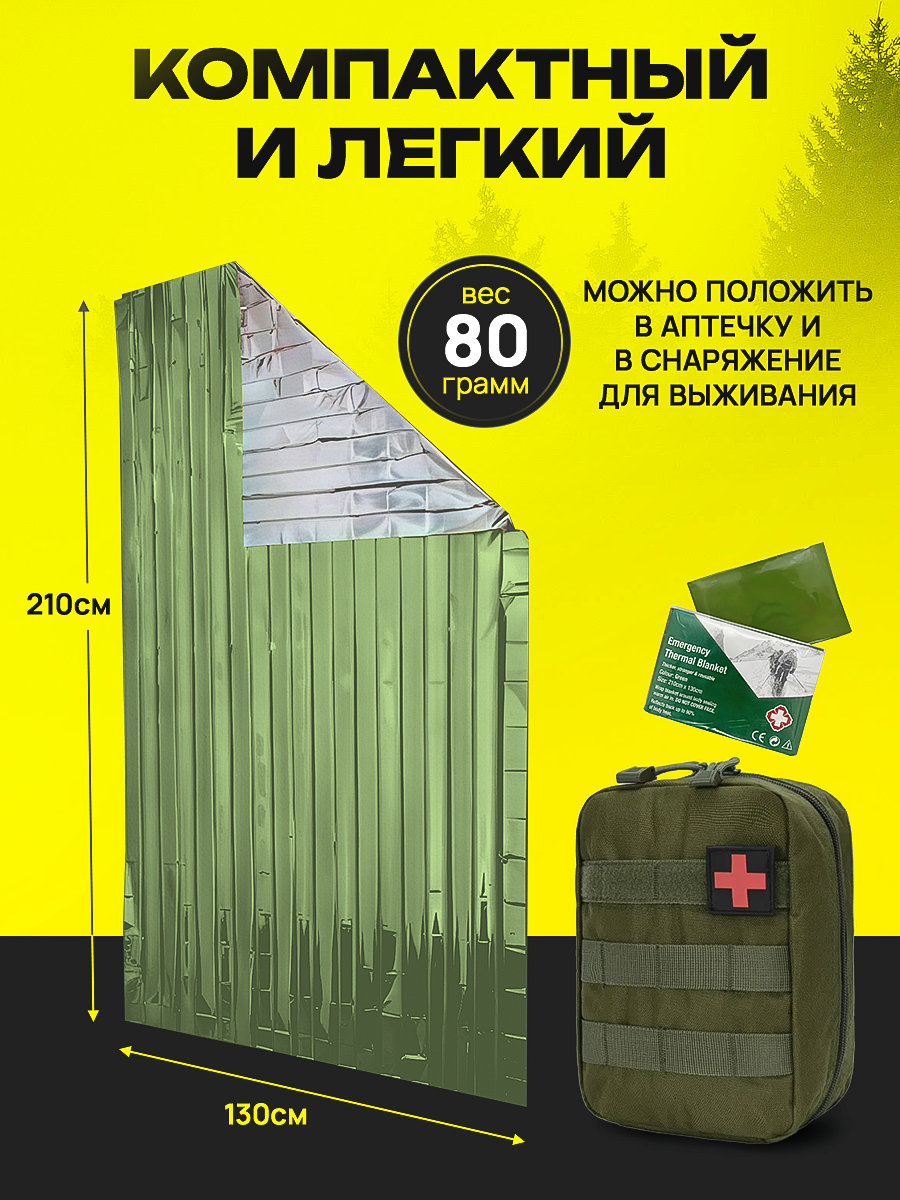 Термоодеяло, 213 х 91 см. олива, металл и фольга, компактная.