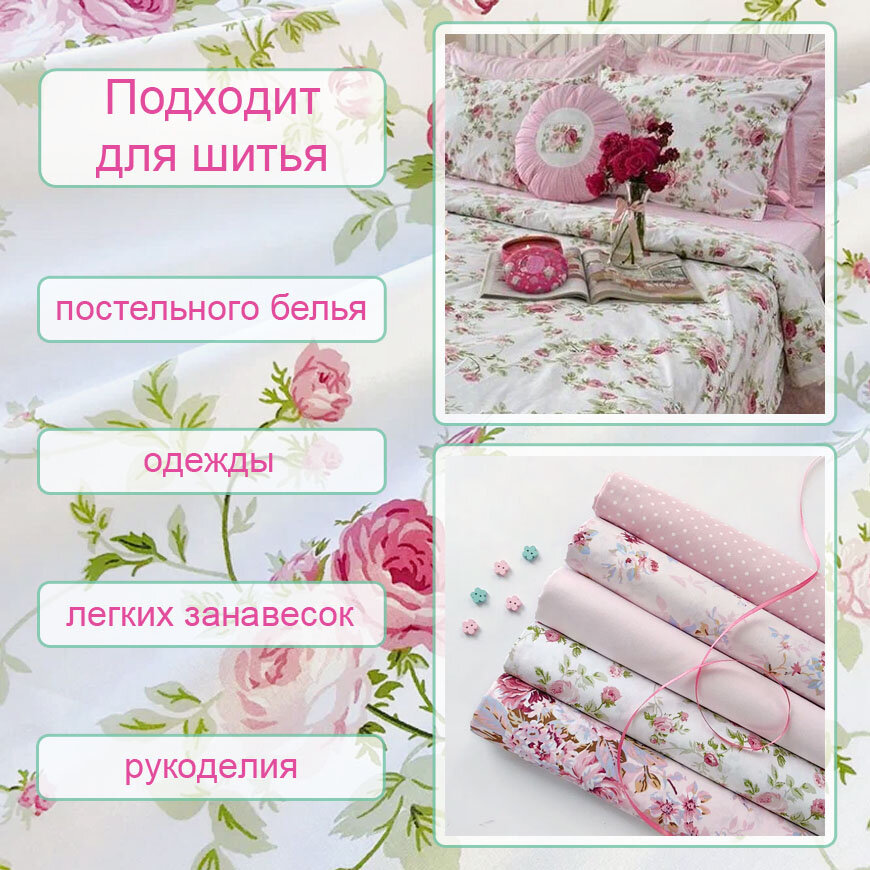 СохранитьТкань для шитья в стиле шебби-шик, 100 % хлопок поплин Турция, белый с розовыми розами, 1 м х 240 см интересное:
